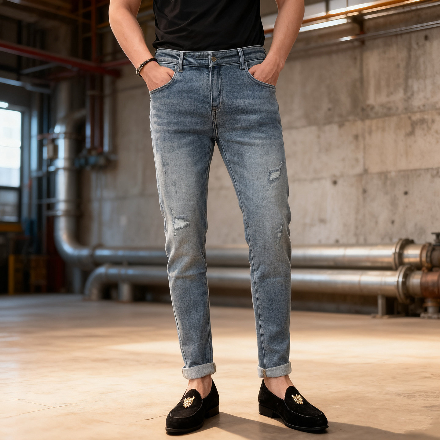 冬季男士破洞牛仔裤潮牌弹力修身小脚高级感复古时尚休闲加绒长裤