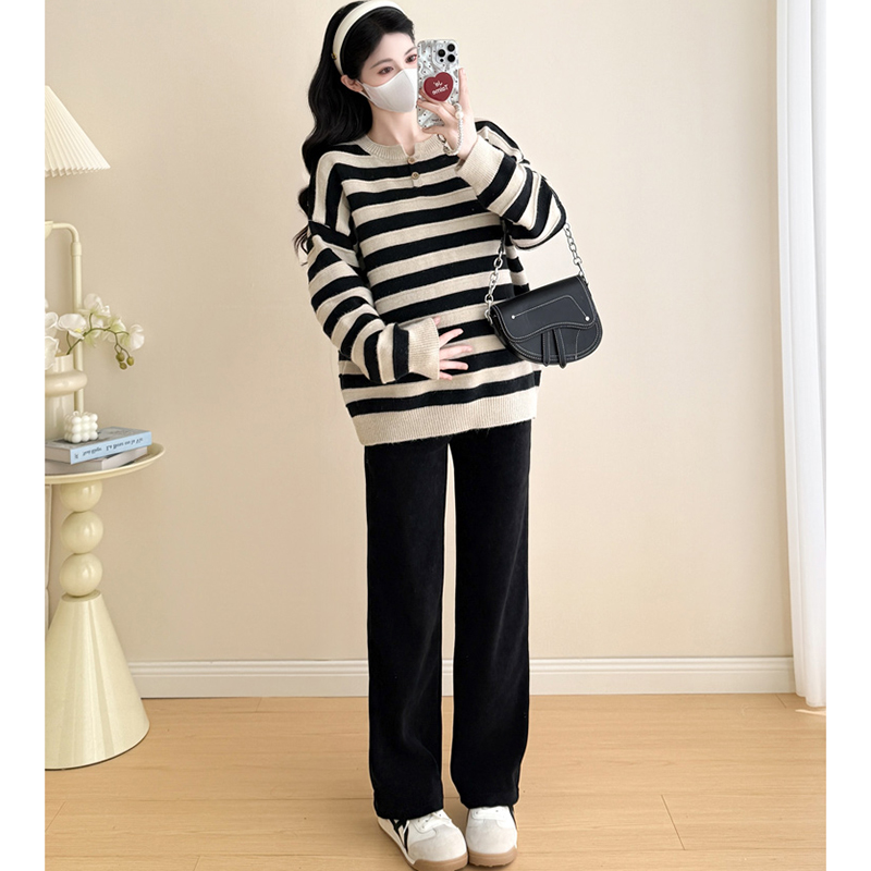 孕妇套装秋冬2025新款法式黑色条纹宽松减龄针织毛衣裤子两件套女