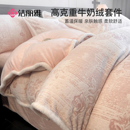 洁丽雅冬季雕花牛奶绒床上四件套珊瑚绒床单毛绒法兰绒床品三件套