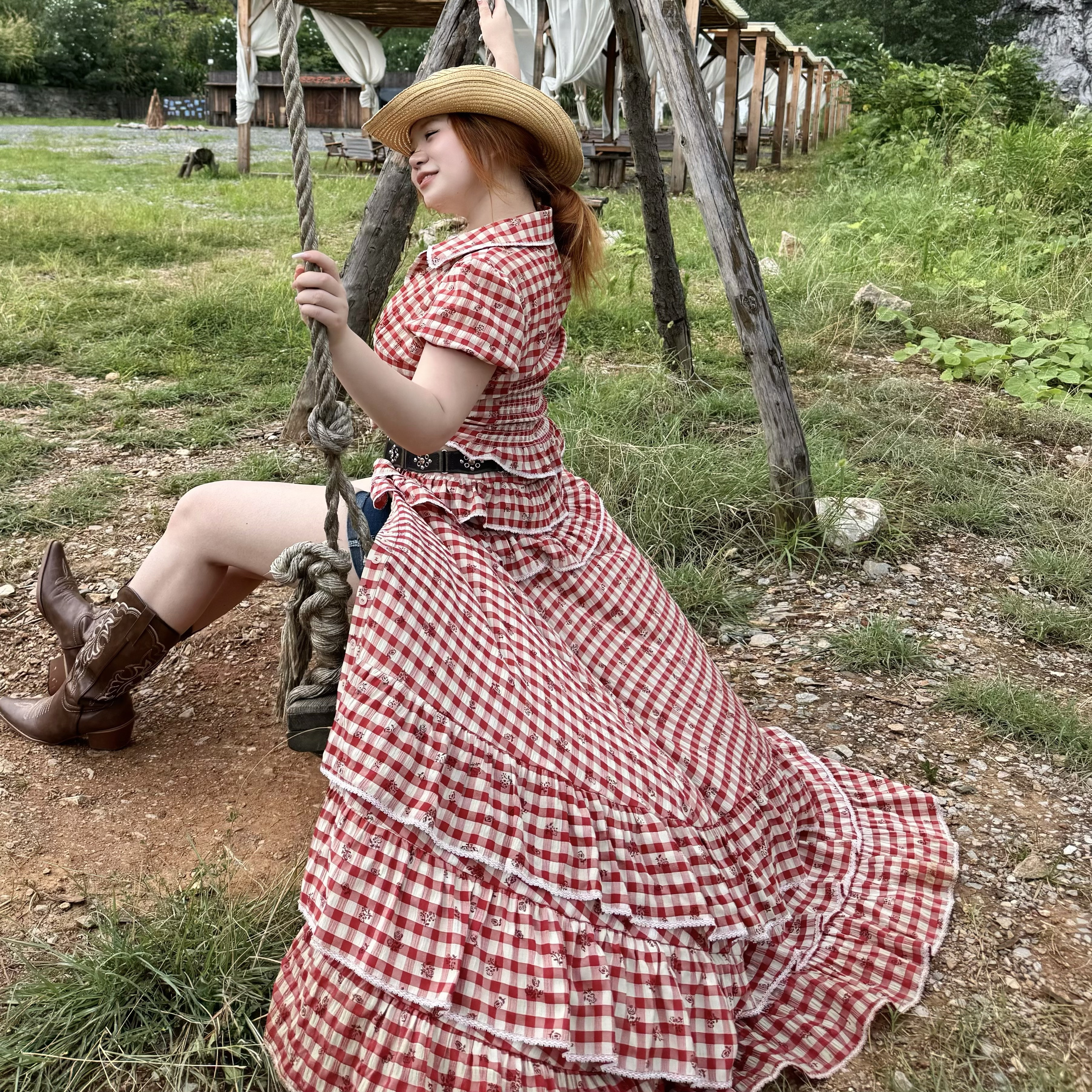 QDD STUDIO/微胖红色格子泡泡袖衬衫大裙摆蕾丝花边新疆穿搭套装