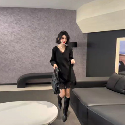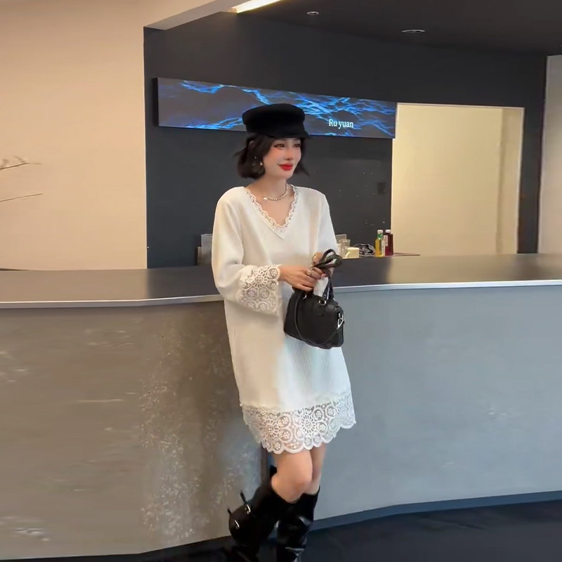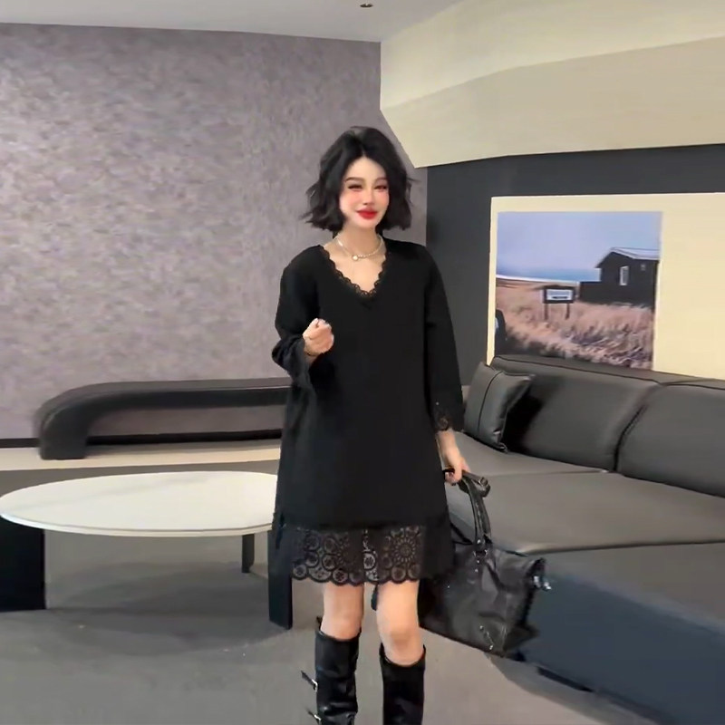 大码女装V领蕾丝边长袖大衫