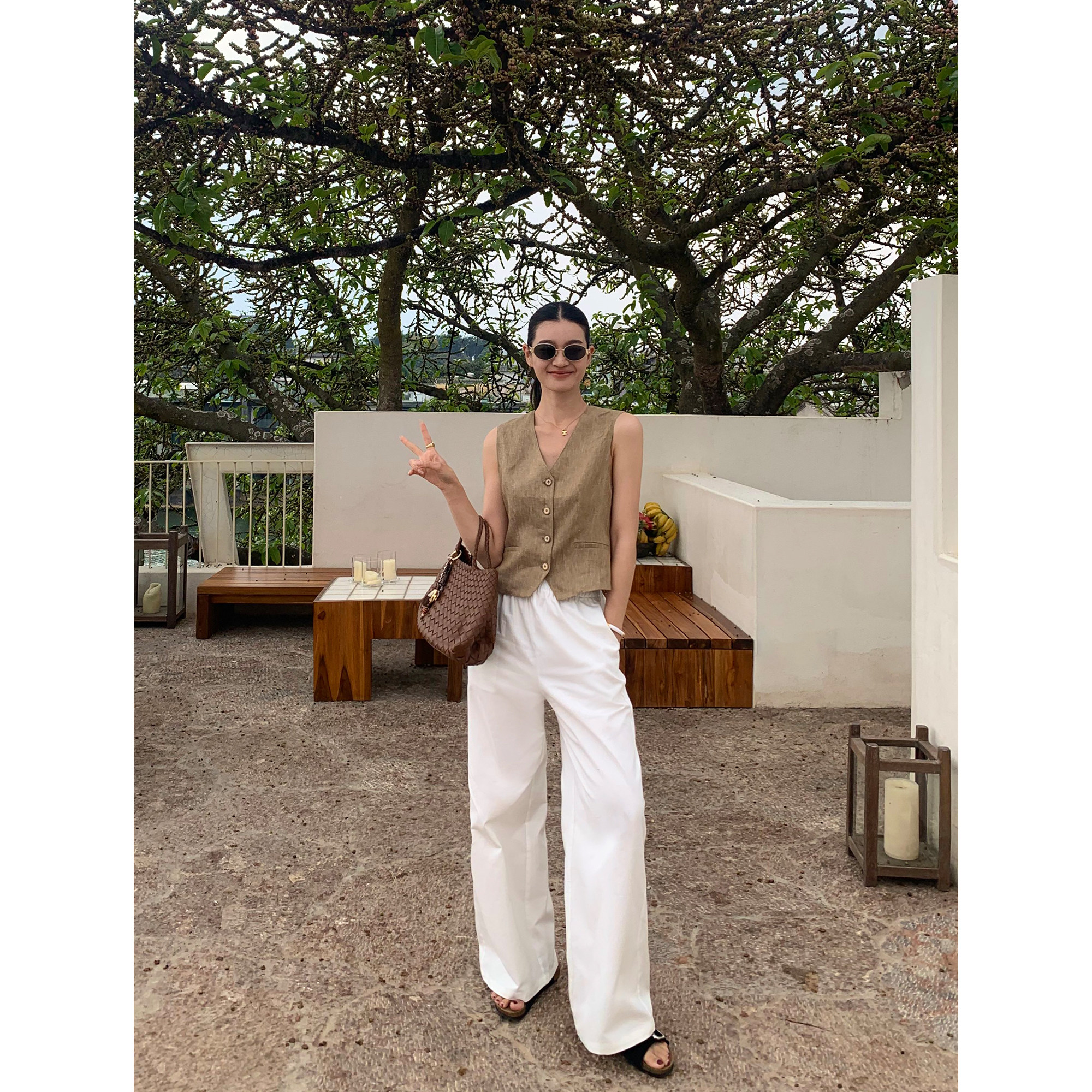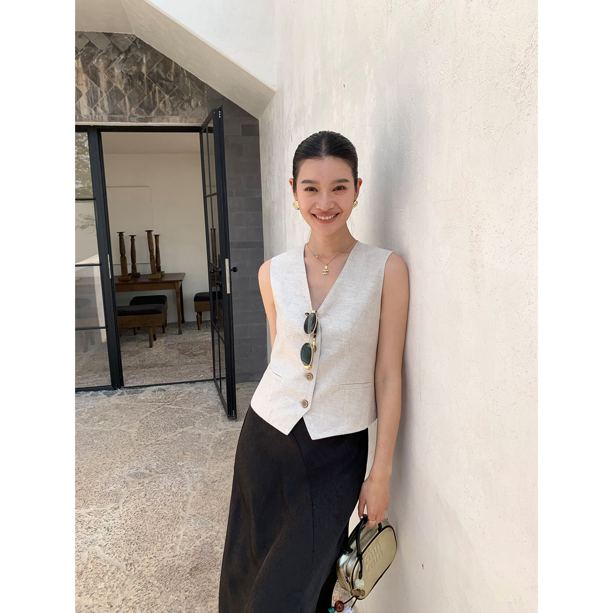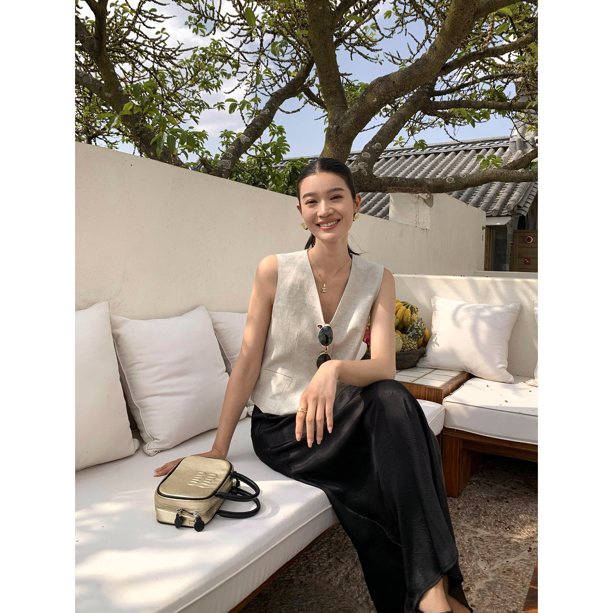 pusumede 复古格调 V领背心马甲女时髦洋气坎肩马夹100%亚麻上衣