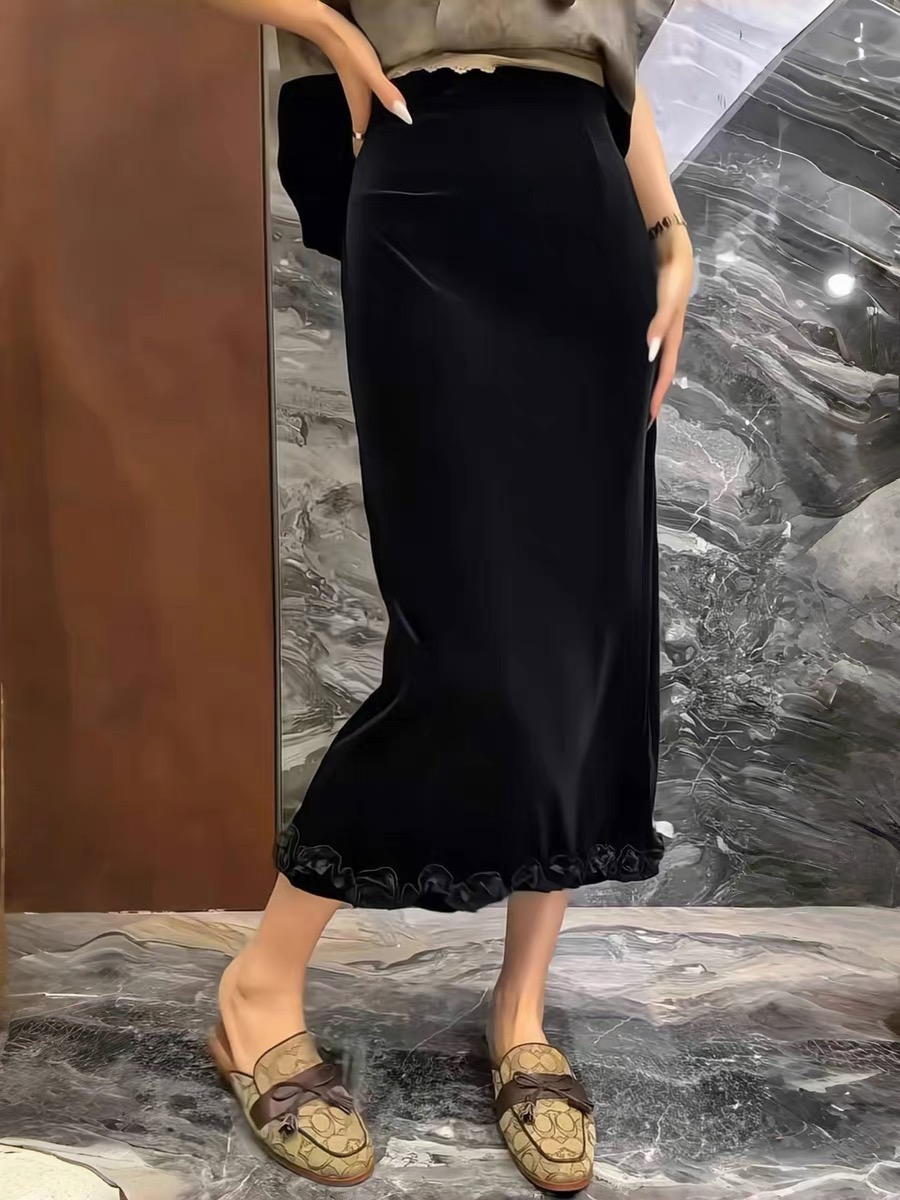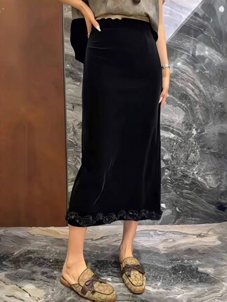时尚百搭高腰木耳边黑色丝绒半身裙女好看开叉包臀裙2025秋季新款