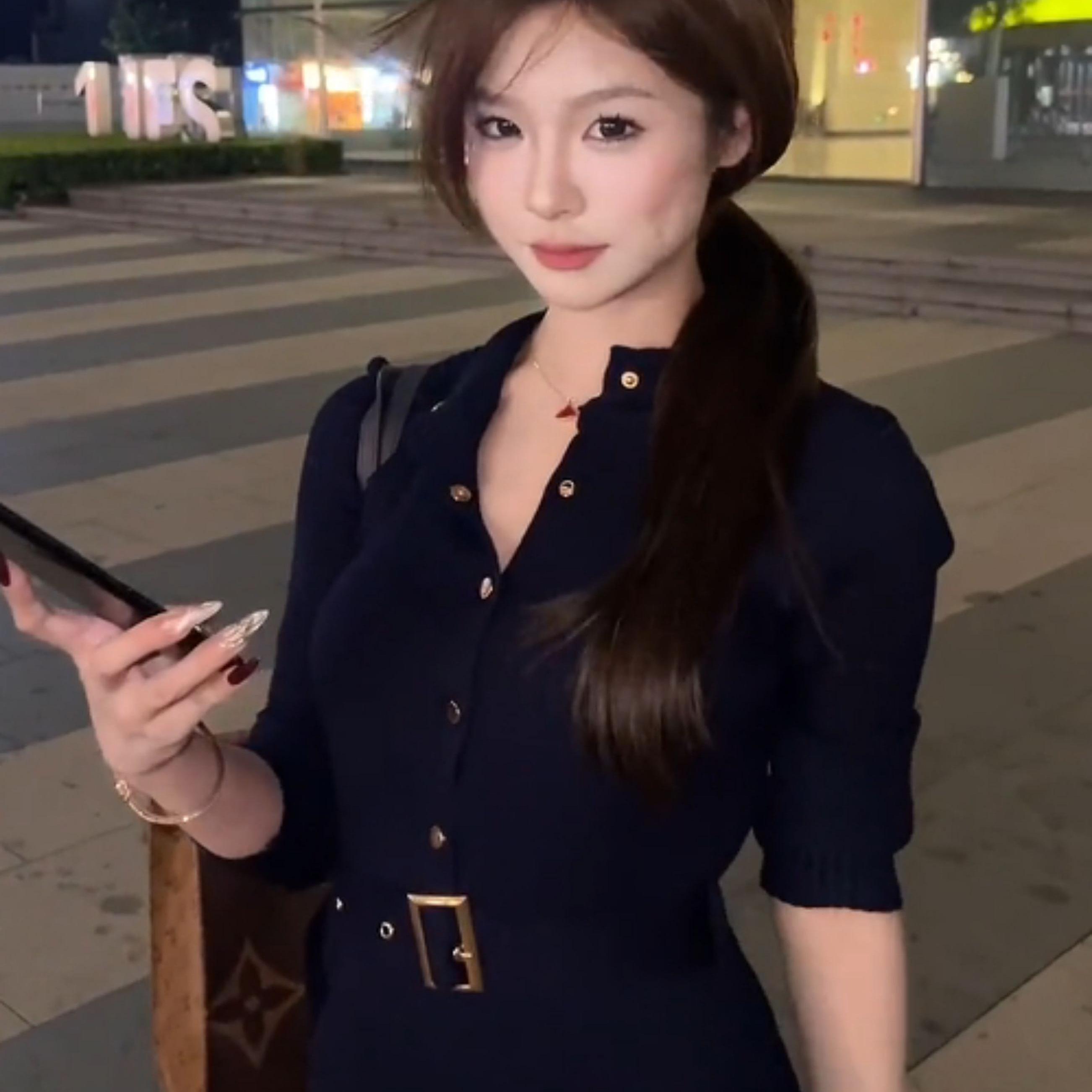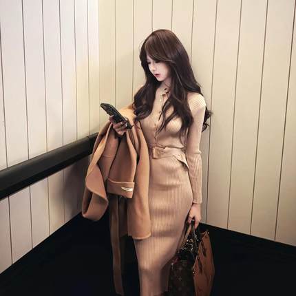 韩国东大门气质圆领针织连衣裙女长袖修身单排扣包臀开叉针织长裙