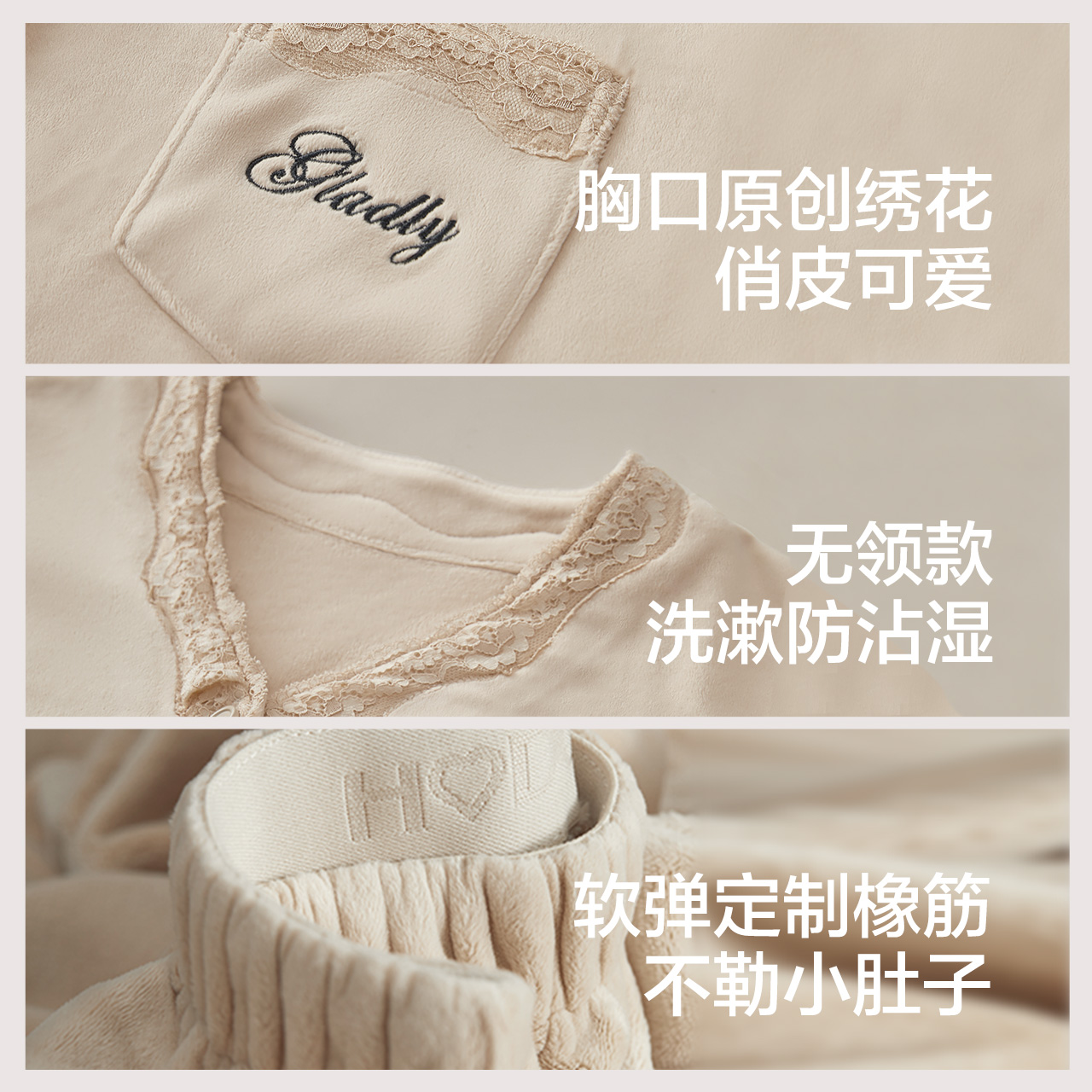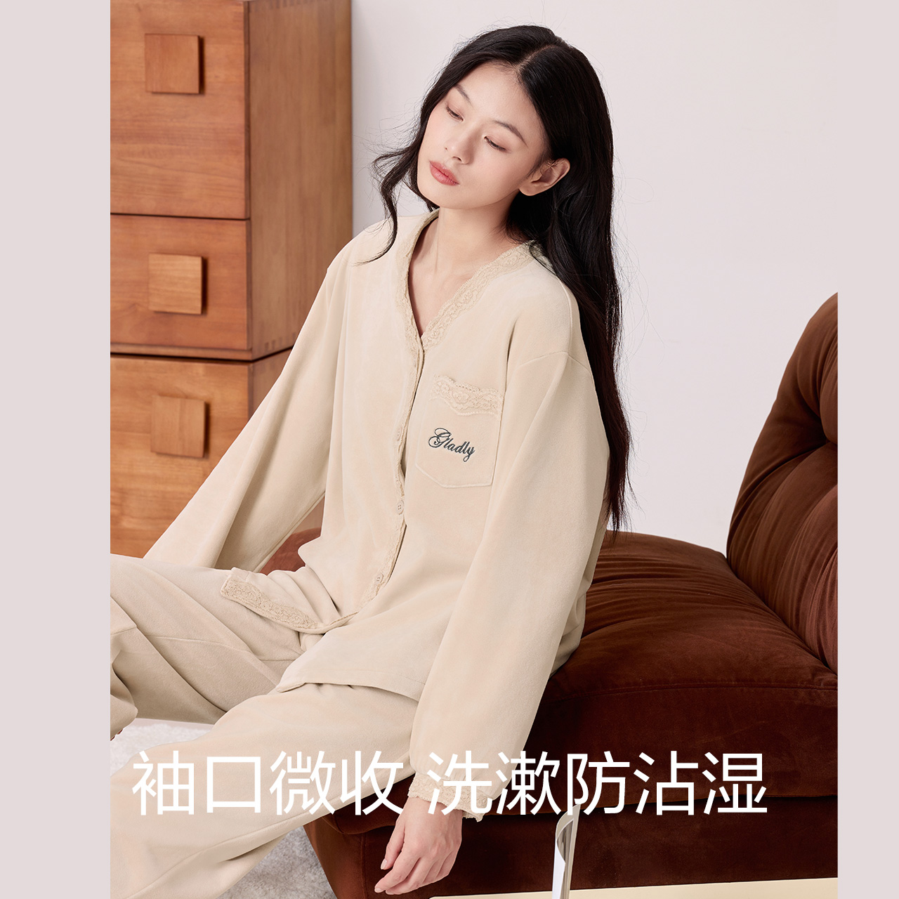 红豆居家抗静电海岛绒睡衣女V领开衫套装家居服套装秋冬季可外穿