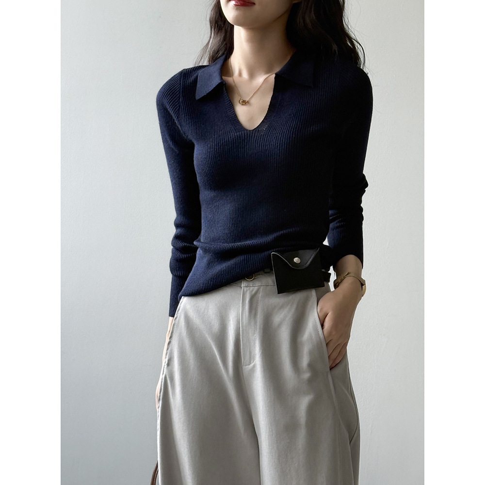 言双 V领针织衫女薄款 秋季修身气质翻领套头长袖打底衫上衣P568