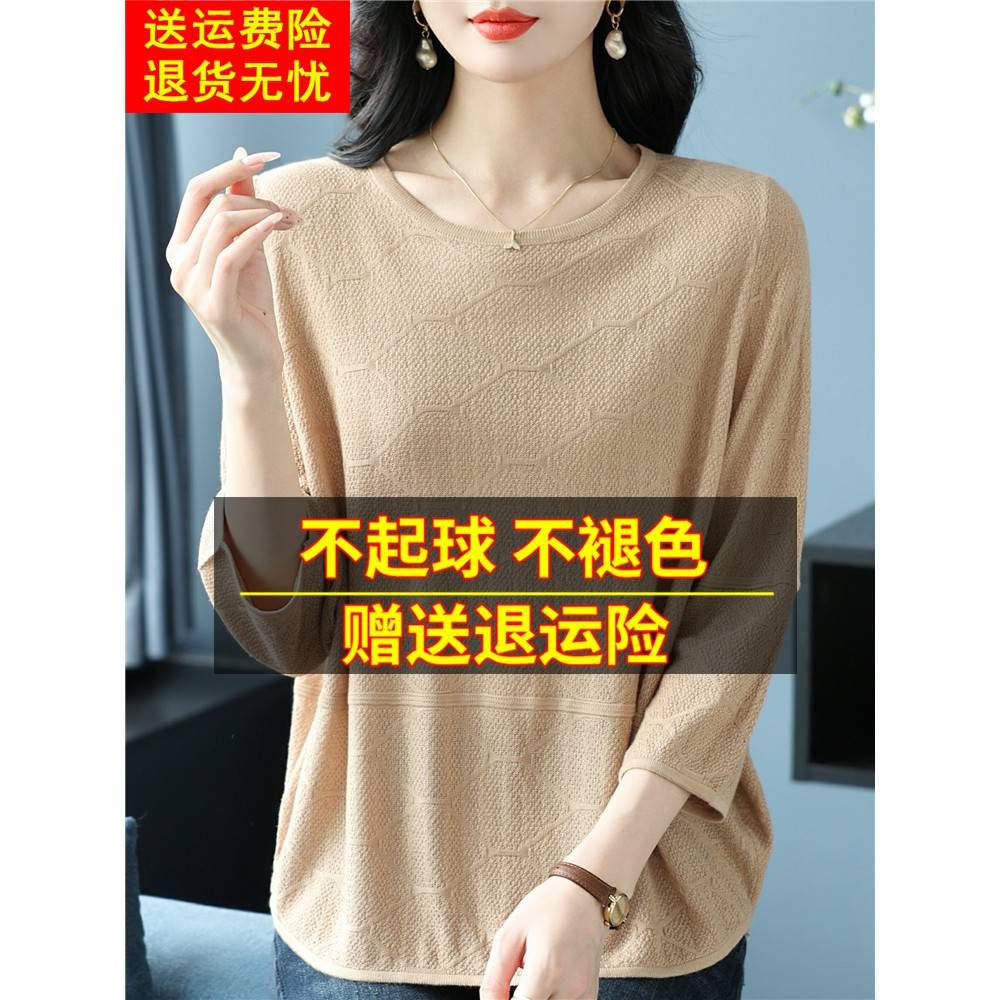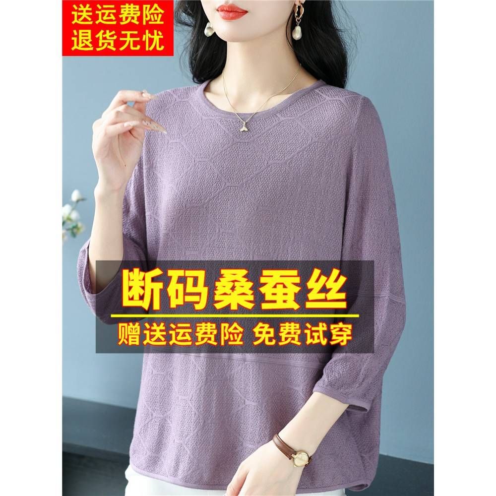 2025新款妈妈桑蚕丝七分袖t恤女装胖mm宽松大码上衣针织打底小衫