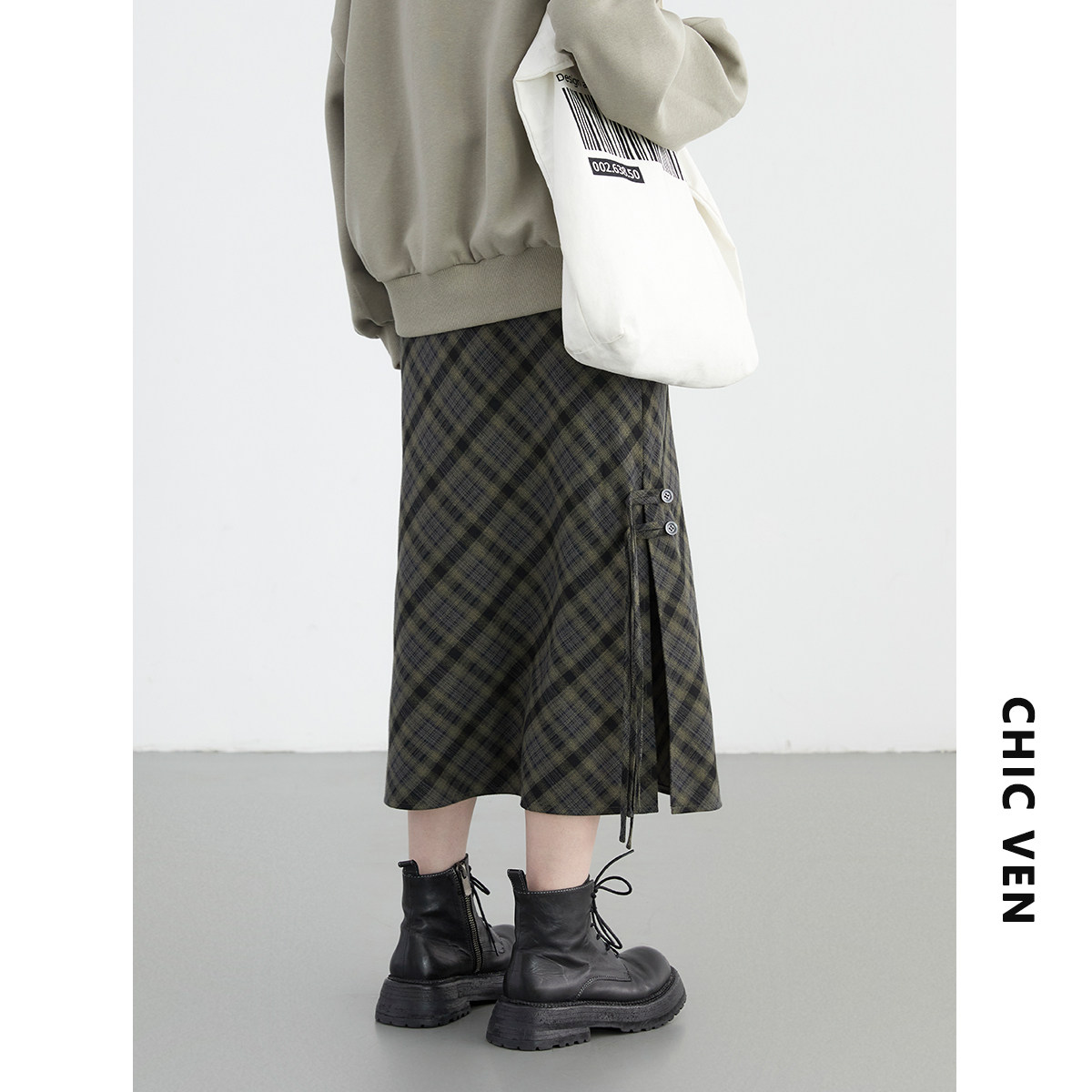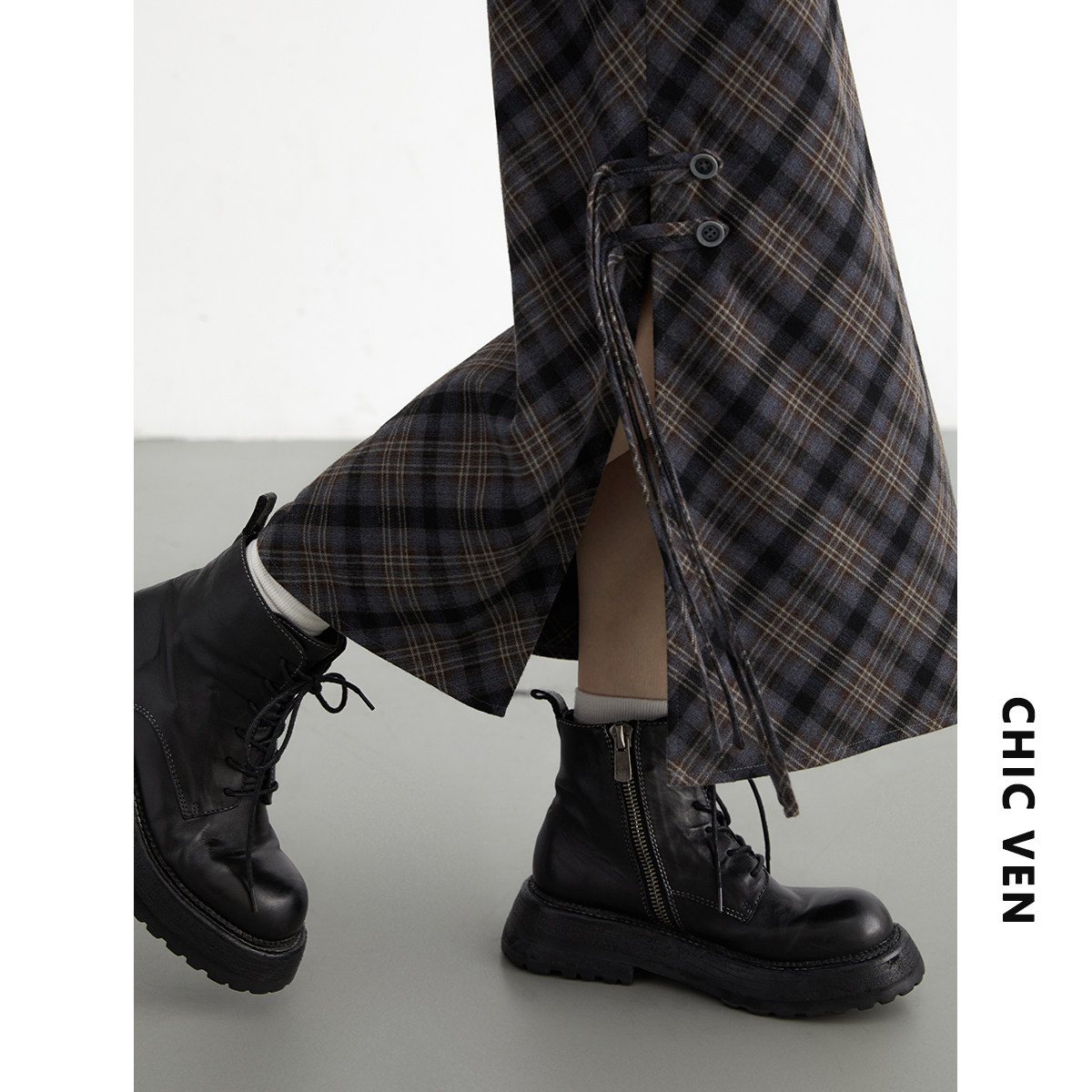 CV大码女装 秋季新款甜酷风高腰开叉格纹半身裙直筒裙长裙胖MM女