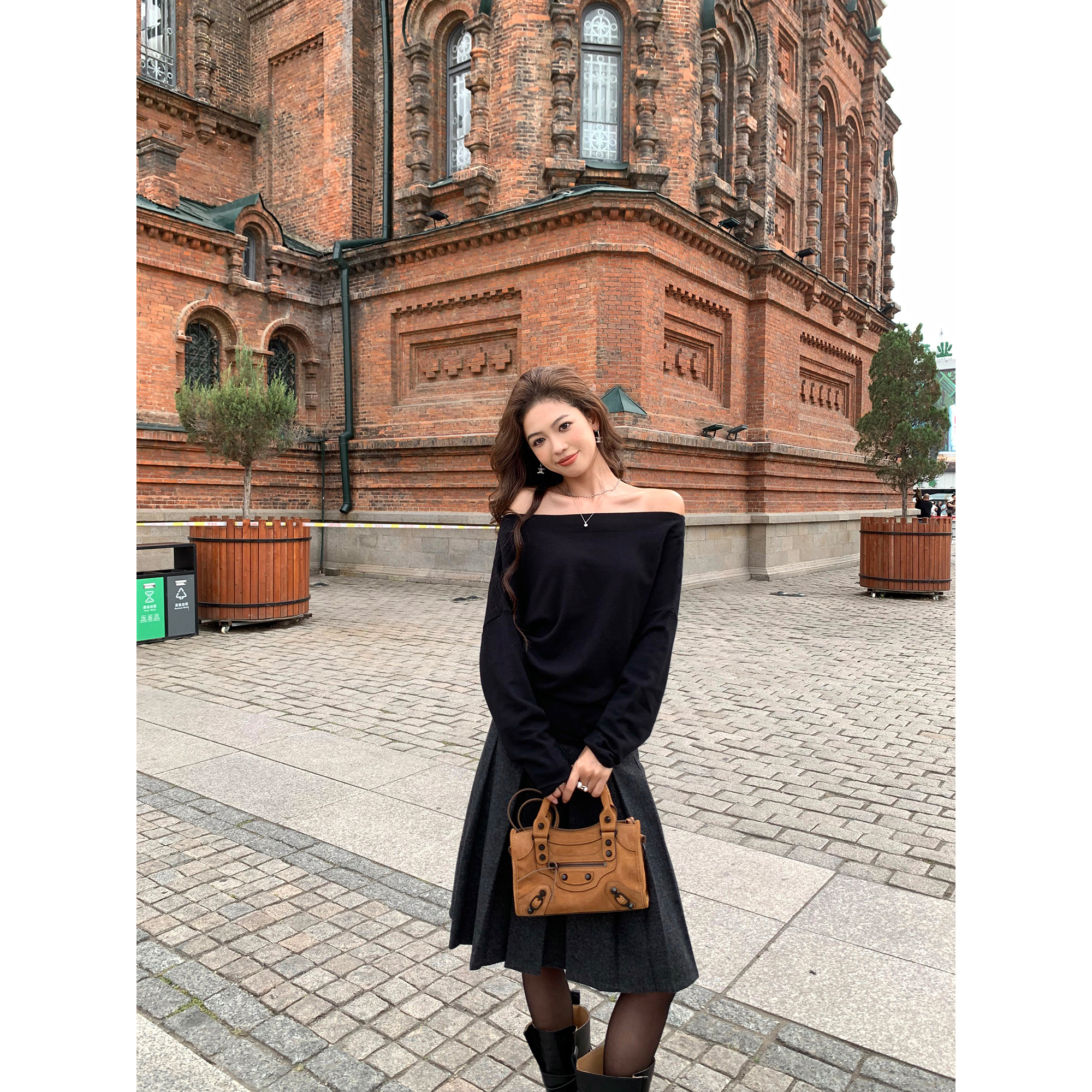pusumede 气质原色 一字肩长袖针织衫女设计感斜肩修身T恤上衣
