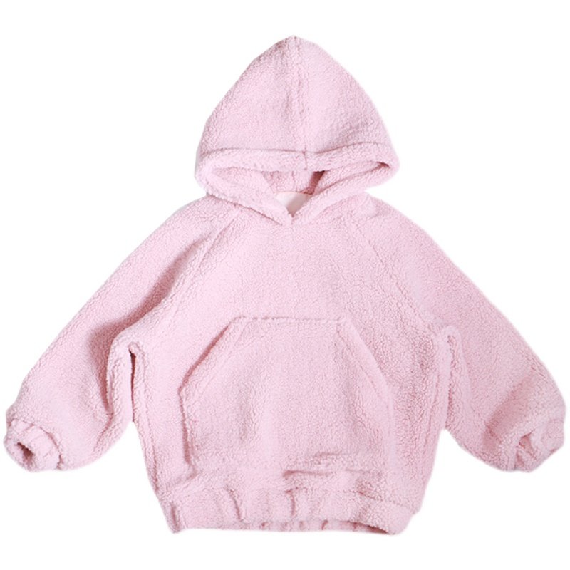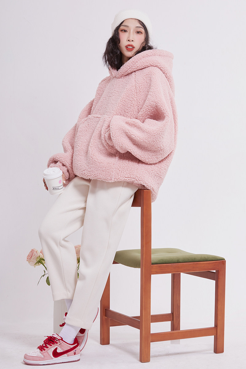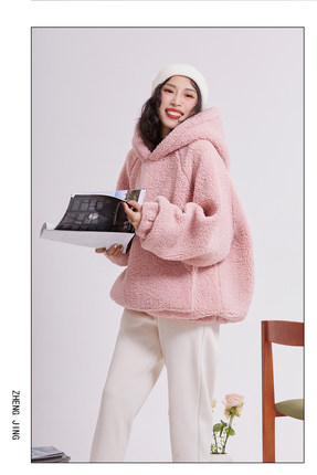 2022冬季新品羊羔毛加厚加绒套头皮粉色卫衣女宽松毛茸茸保暖外套