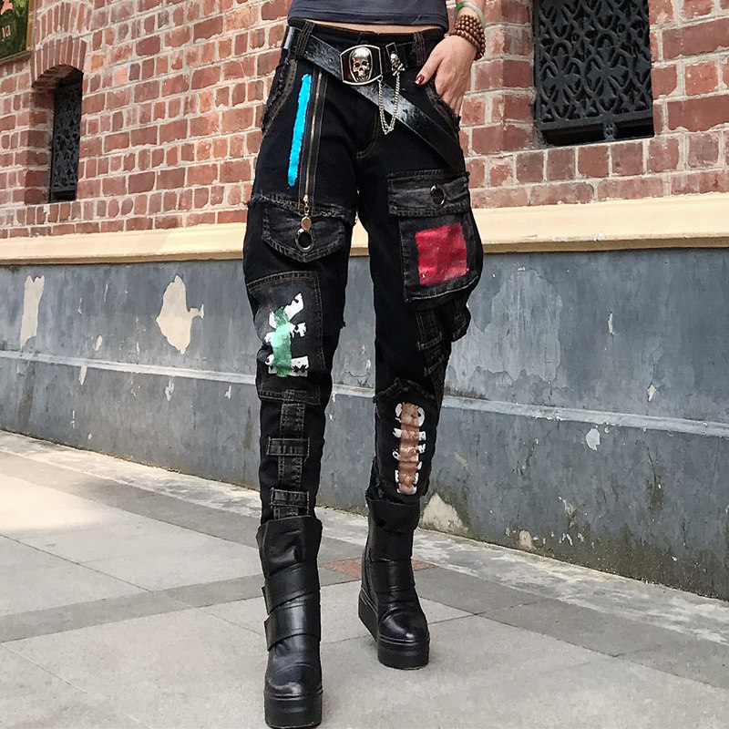 欧洲站春季帅气bf风个性哈伦裤女长裤牛仔裤宽松小脚裤朋克裤子潮