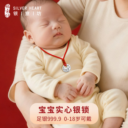 宝宝出生见面礼平安锁9999纯银实心吊坠银锁长命锁婴儿项链满月礼