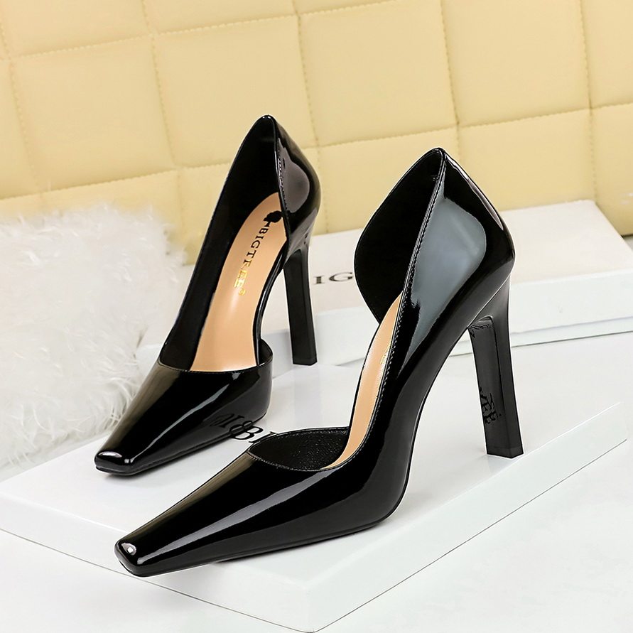 超高跟漆皮浅口侧镂空方头单鞋