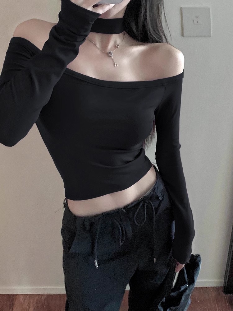 辣妹锁骨一字肩挂脖性感长袖t恤