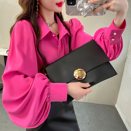 大码灯笼袖衬衫女高级感轻奢减龄洋气衬衣气质翻领纯色雪纺上衣春