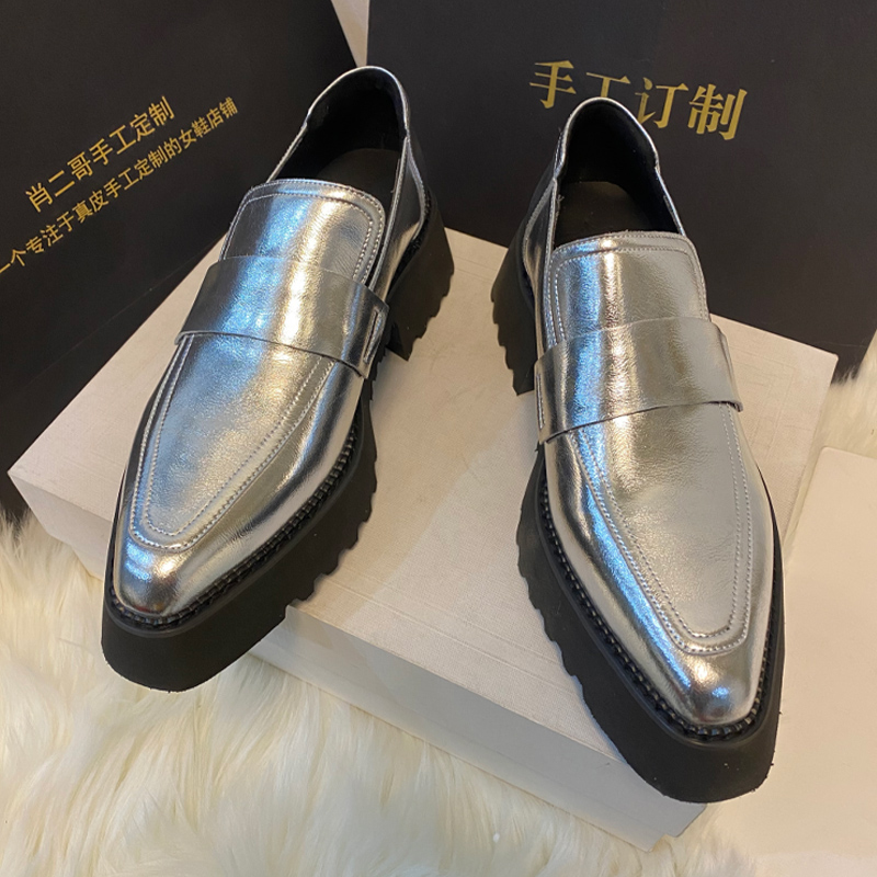 真皮时髦尖头厚底乐福鞋酷松糕鞋女夏季街头单鞋时尚一脚蹬深口鞋