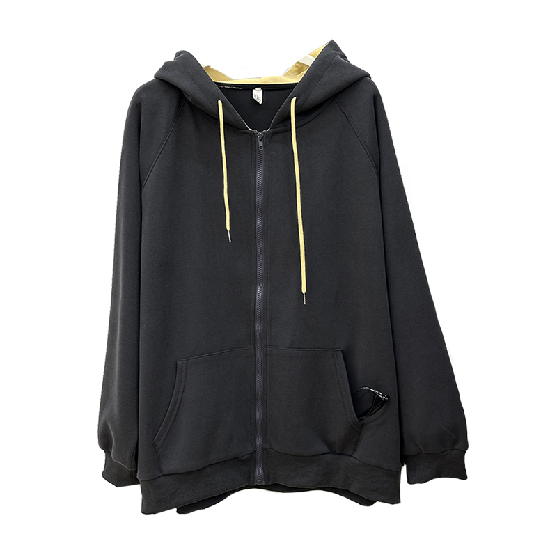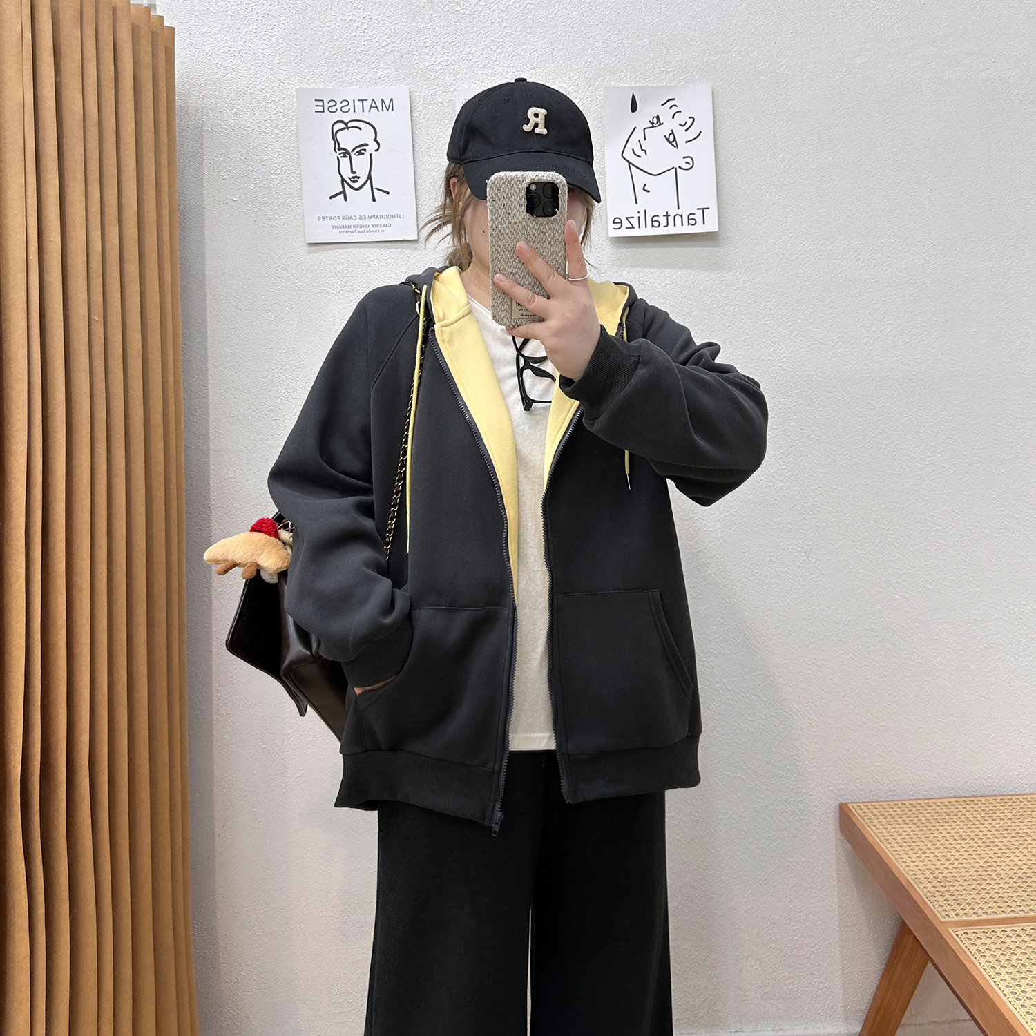 宛宛大码撞色长袖T恤连帽卫衣女秋冬装胖mm显瘦拉链开衫外套上衣