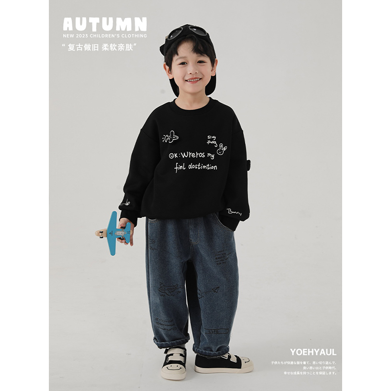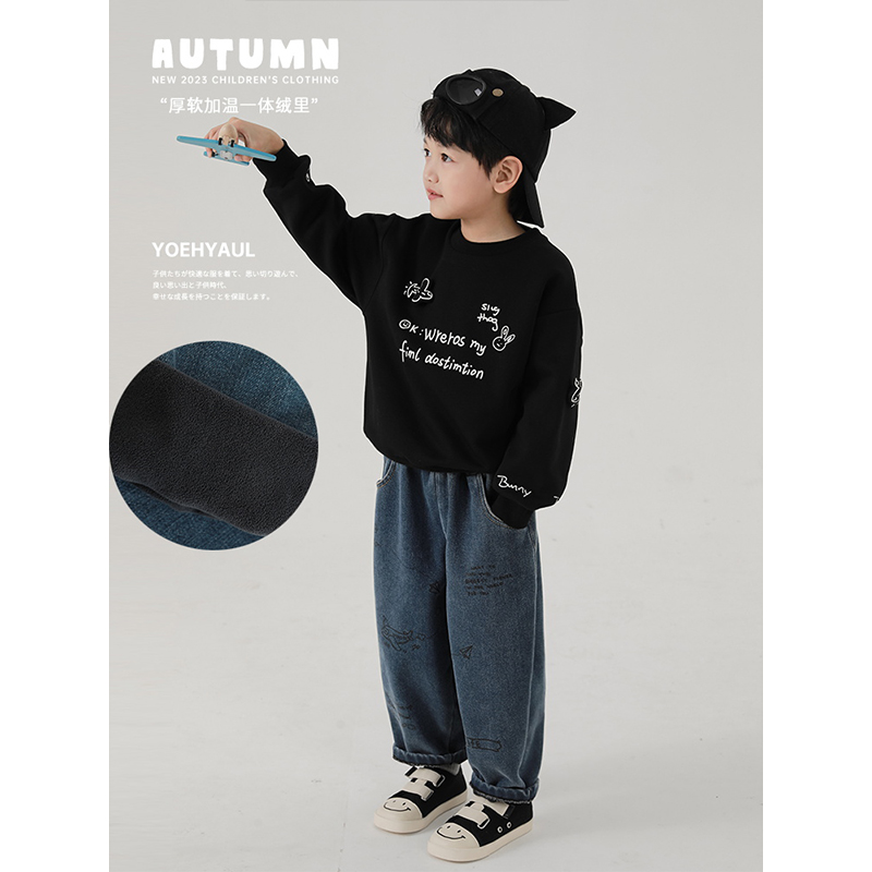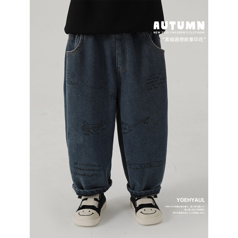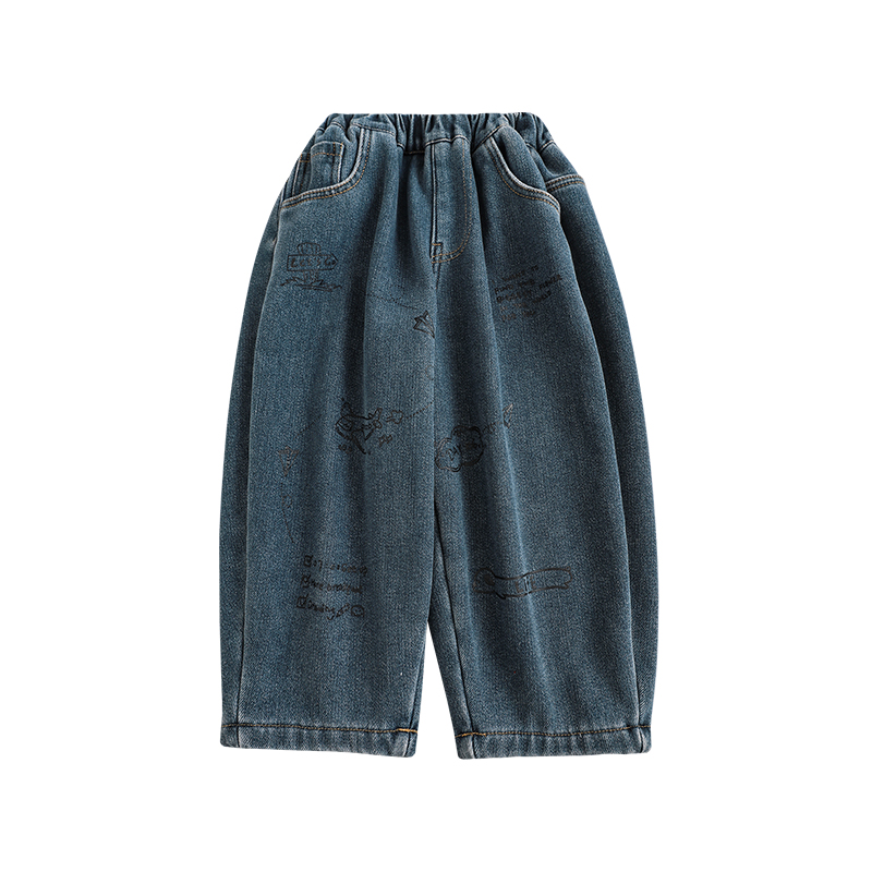 幼悠男童印花软弹宽松加绒加厚牛仔裤冬季新款儿童休闲裤子韩版潮