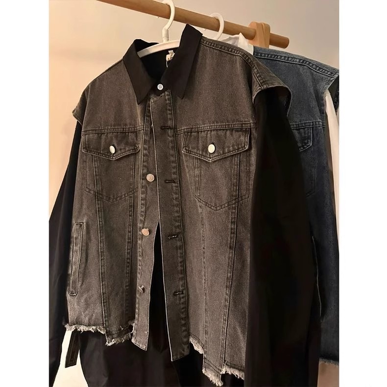 大码300斤美式复古假两件衬衫外套女春秋季胖mm宽松牛仔拼接夹克