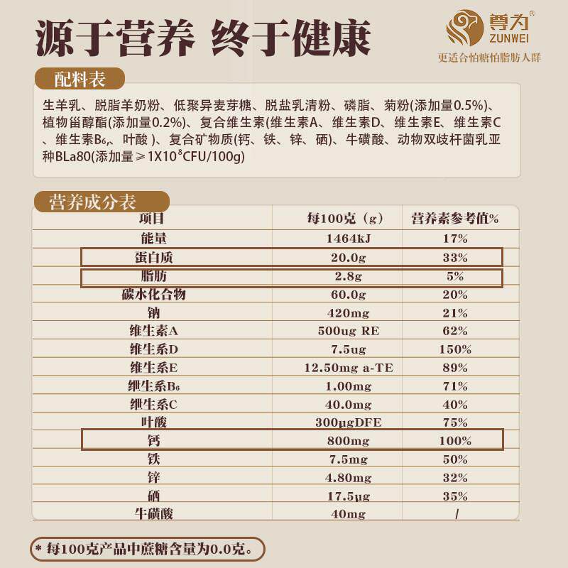 尊为低脂高钙羊奶小粉无蔗糖中老年人低脂HHQ粉羊乳奶375g独立包