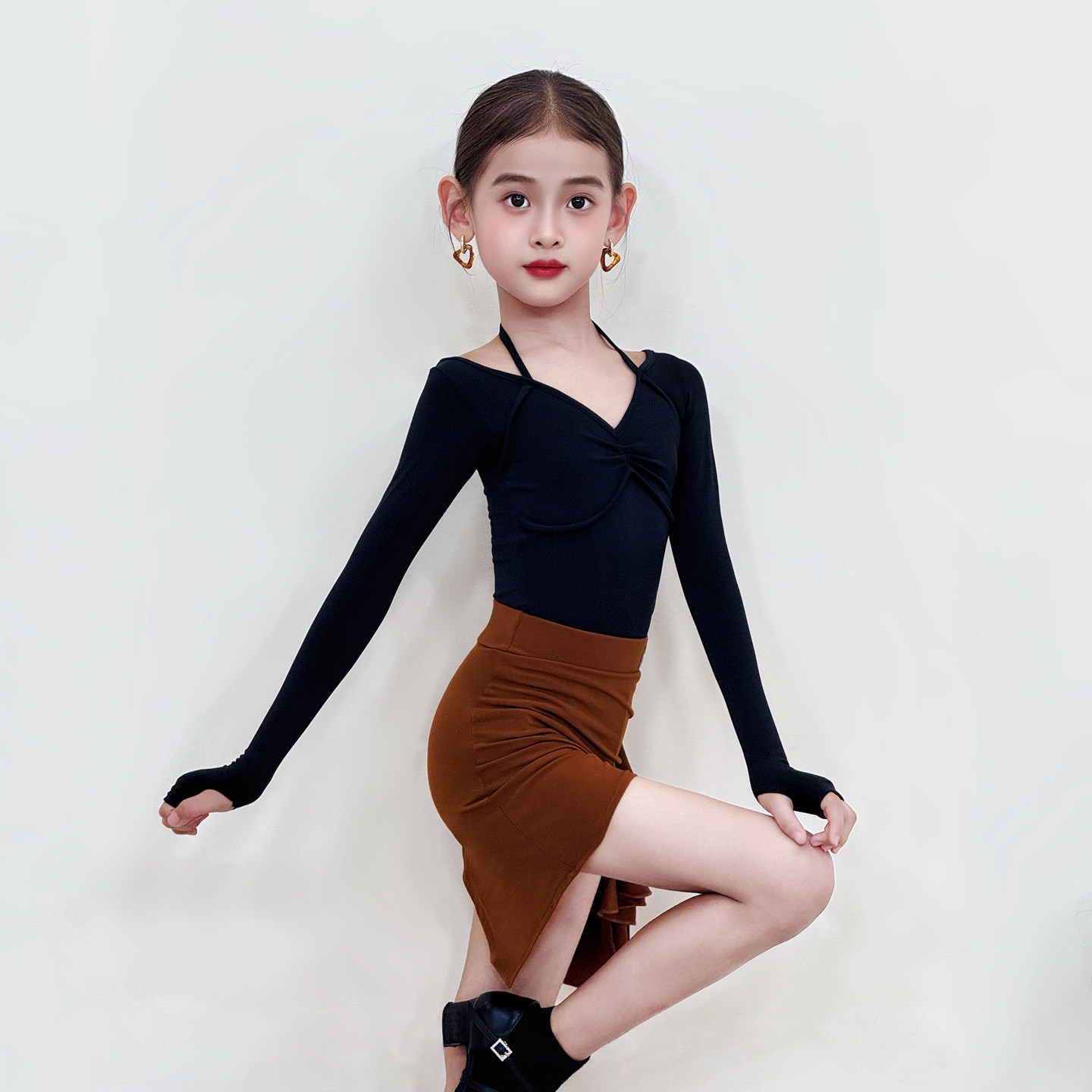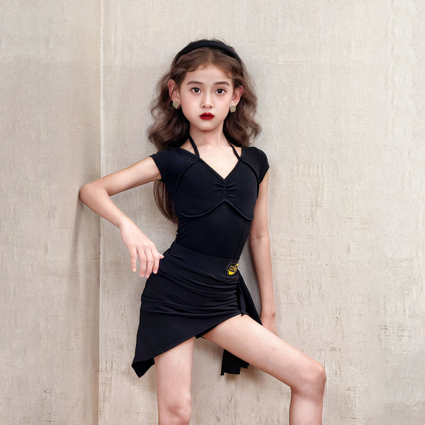 CONNY专业拉丁舞套装女半身裙短袖上衣儿童日常训练舞蹈练功服黑