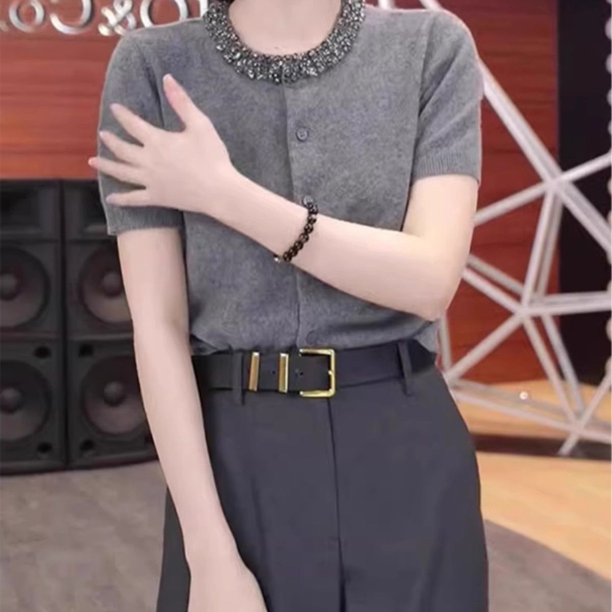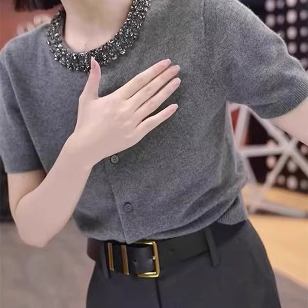 早春法式通勤短袖t恤上衣夏季新款纯色圆领高级感重工镶钻针织衫