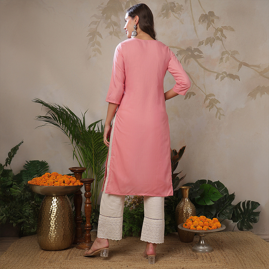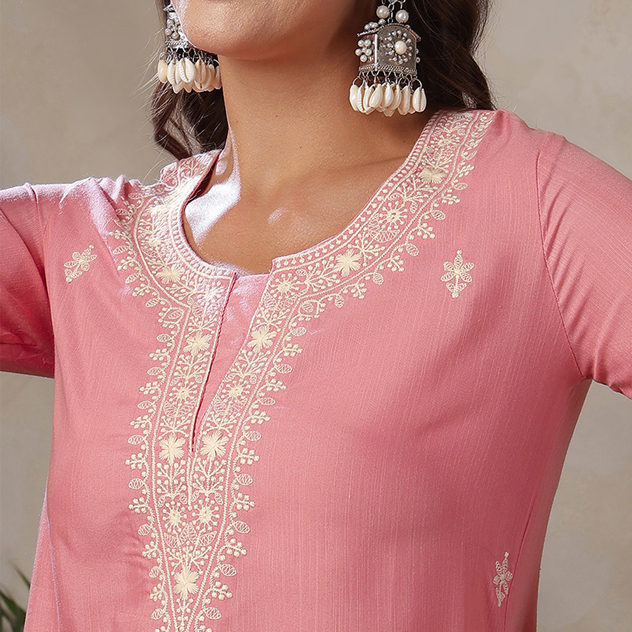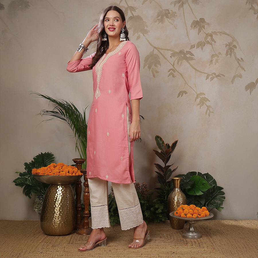印度风女日常传统服装刺绣粉色圆领七分袖中长款薄款棉混纺上衣