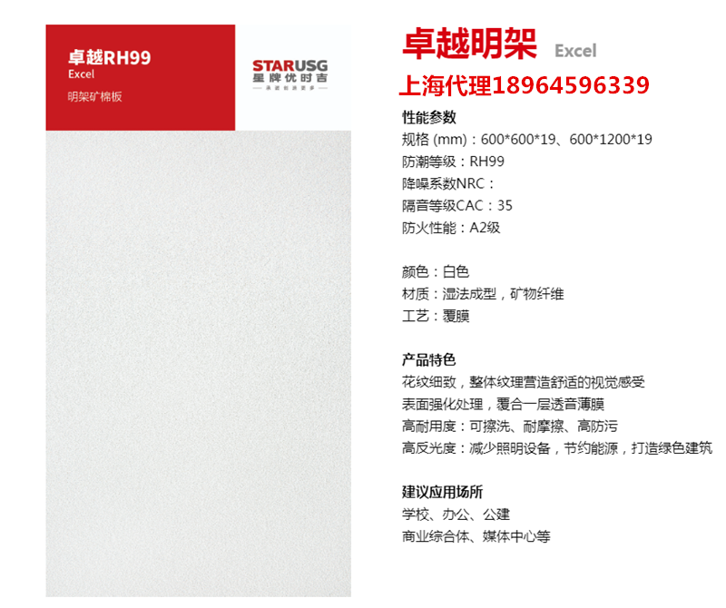 星牌优时吉矿棉板600x600卓越RH99明架覆膜天花板办公室吊顶
