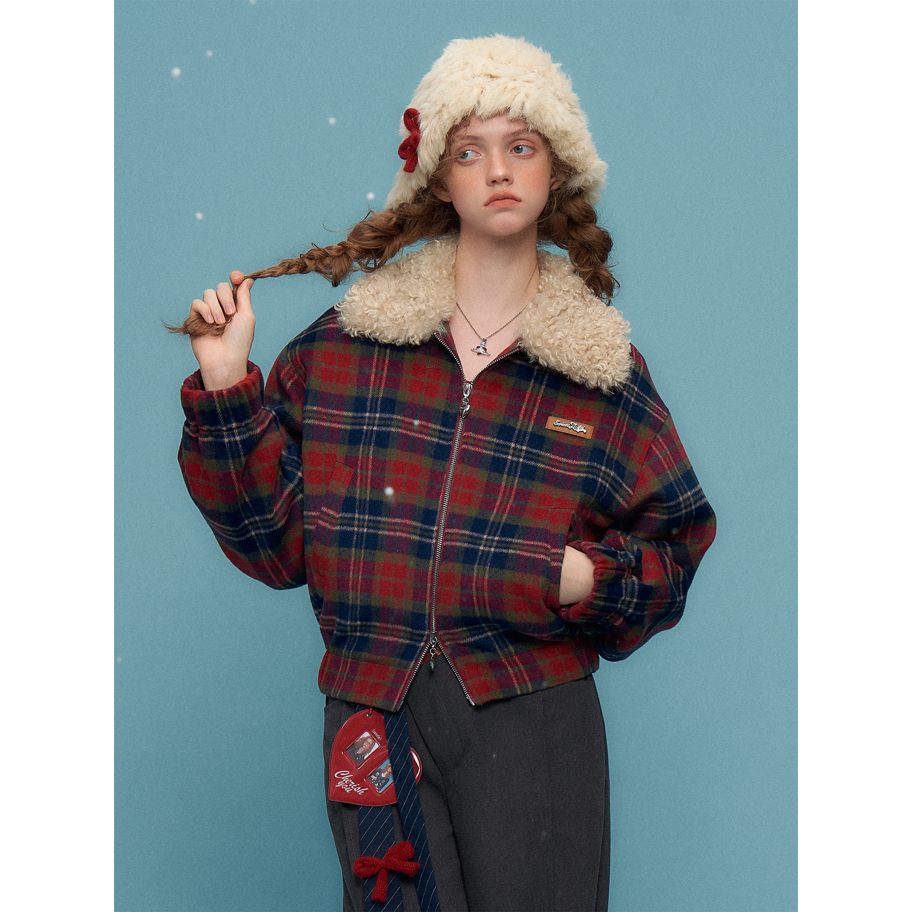 ziziFei秋冬新款美式复古设计感短款红蓝格纹毛领加绒格子外套女