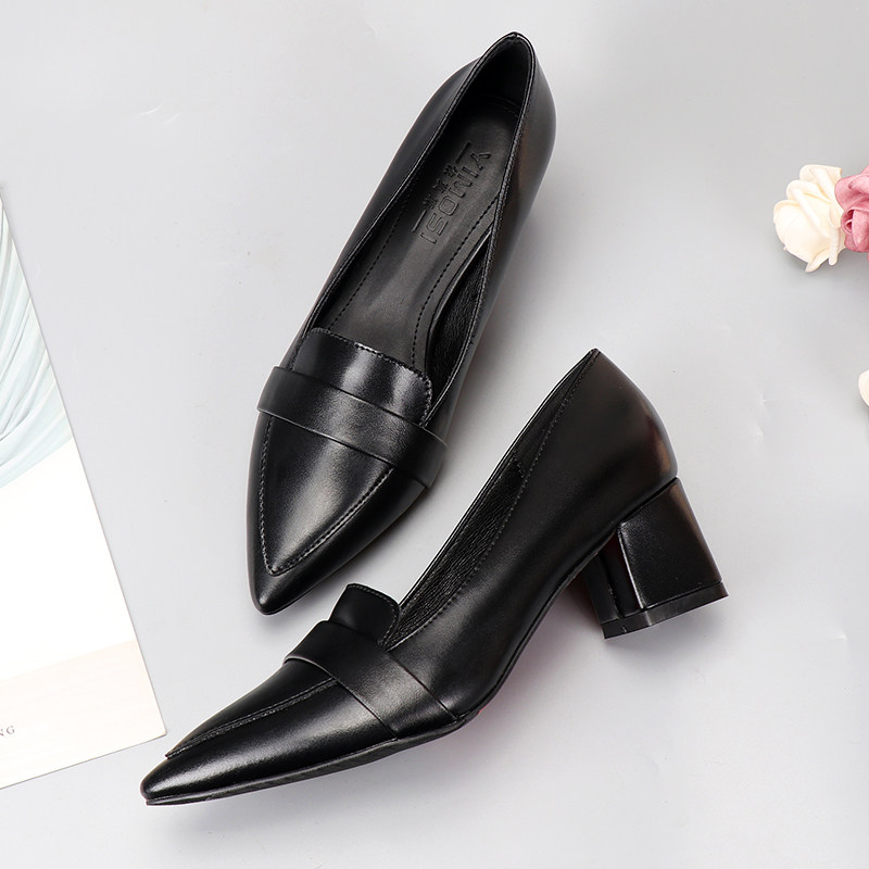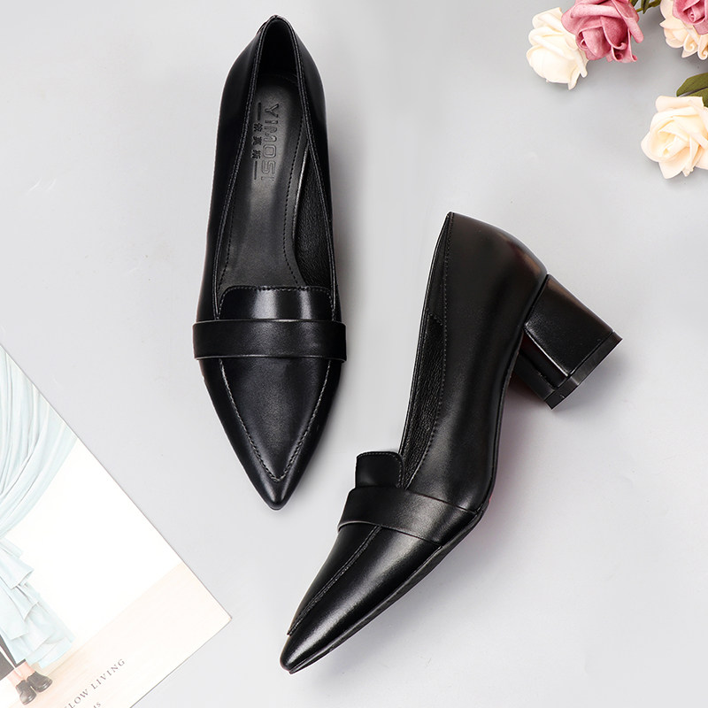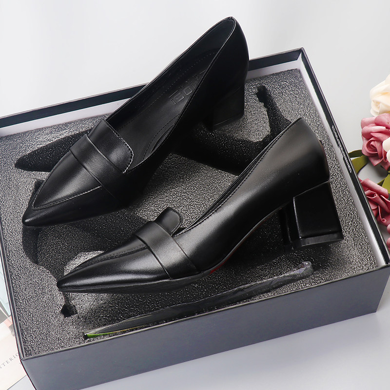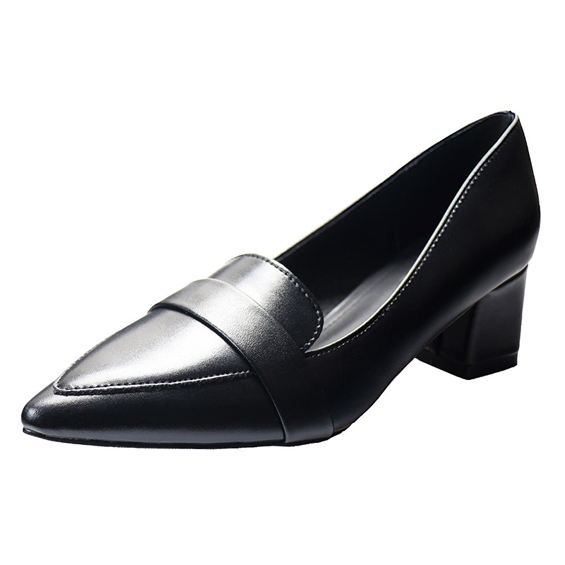 大码女鞋粗跟黑色工作高跟单鞋职业皮鞋尖头软底上班春秋工装中跟