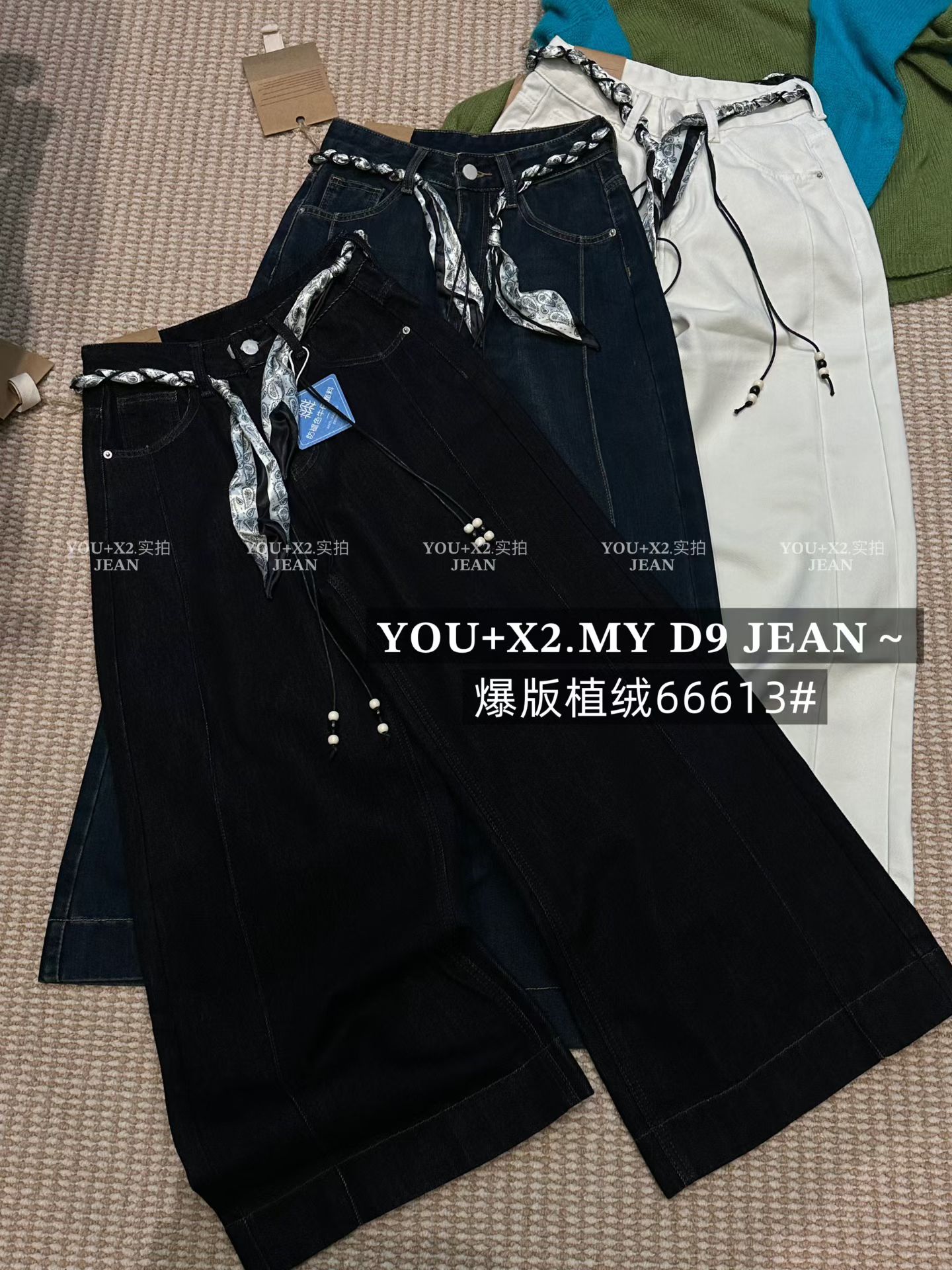 2025冬季新款植绒洋气坑条遮胯修身百搭修身显瘦配腰带直筒牛仔裤