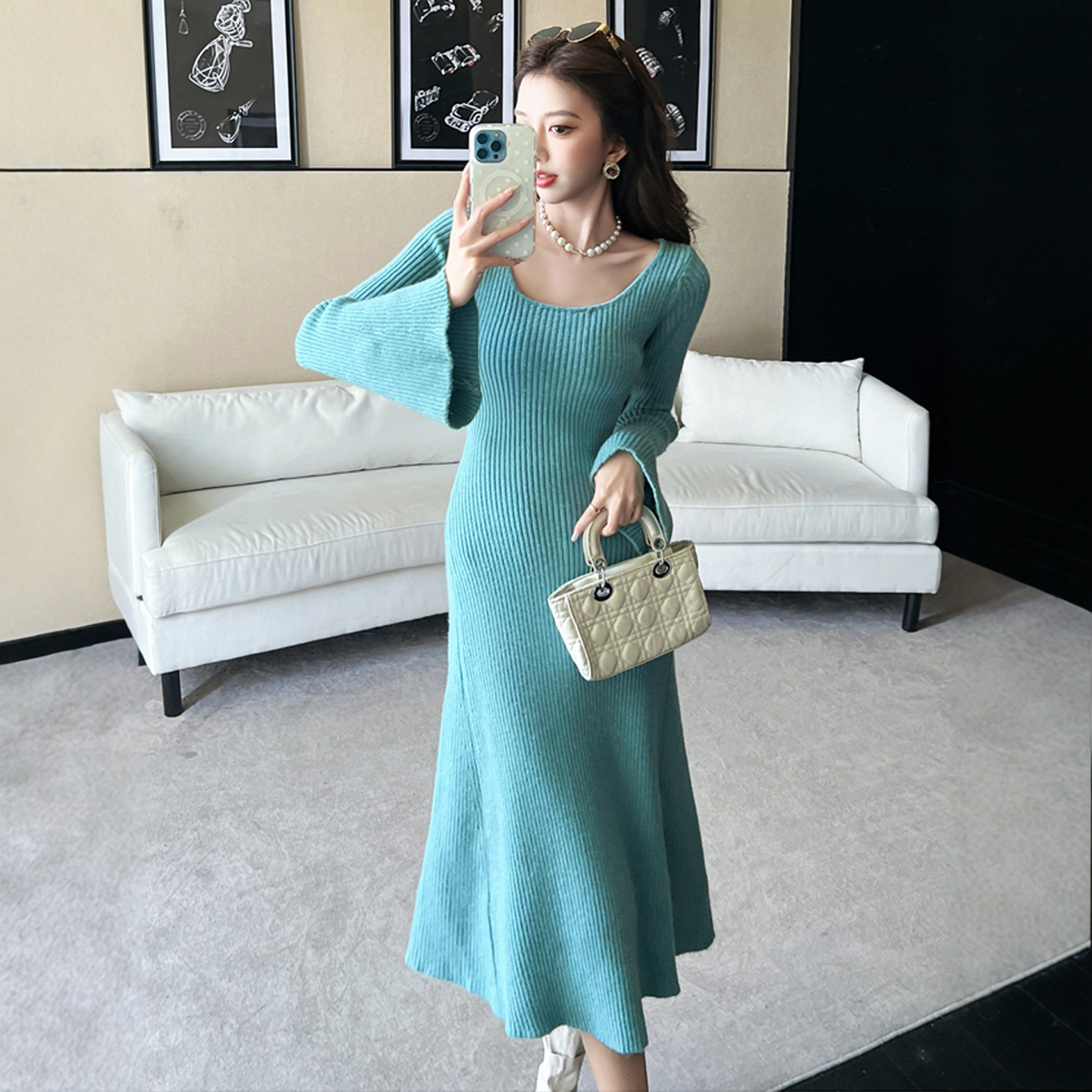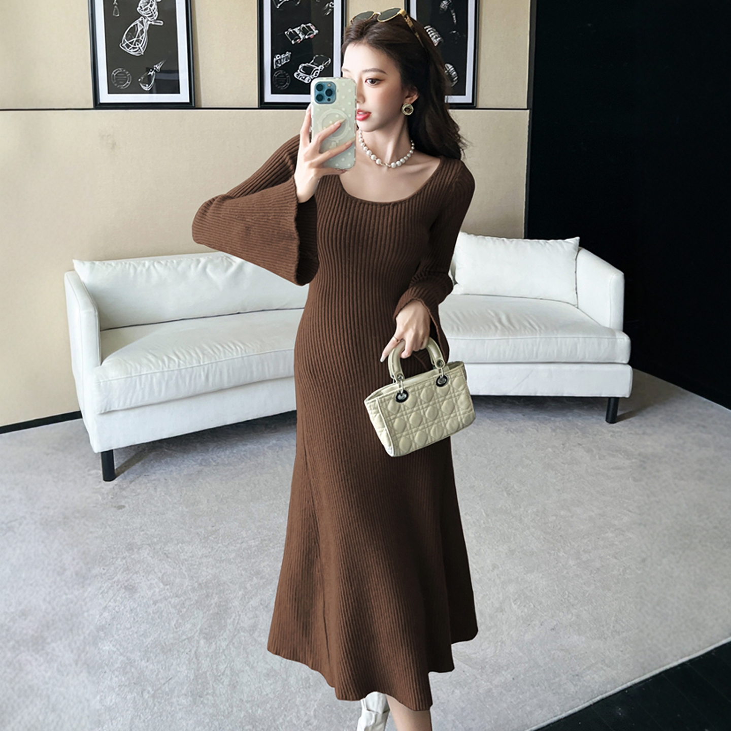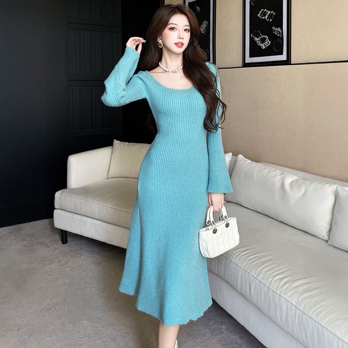 针织连衣裙女秋冬法式高级感港风复古法式喇叭袖U领打底毛衣长裙