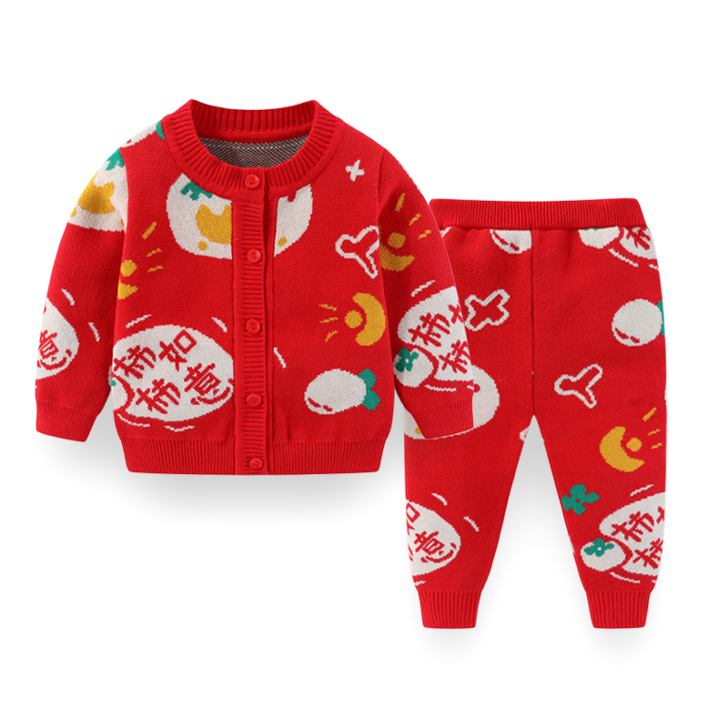 宝宝加厚红色毛衣套装2025冬季拜年服男女小童过年冬装针织打底衫