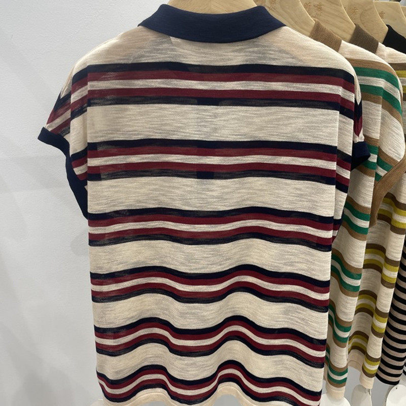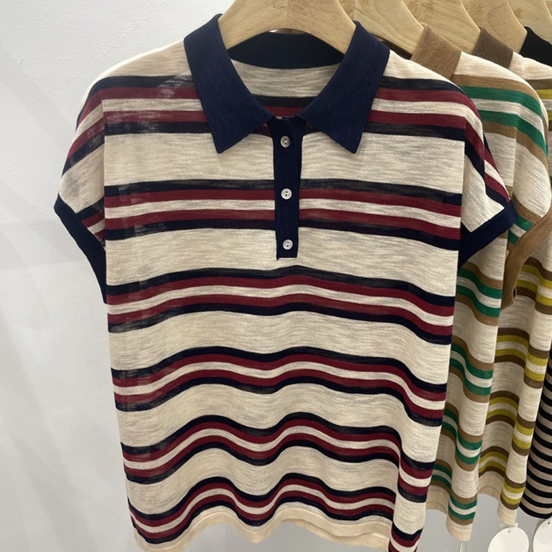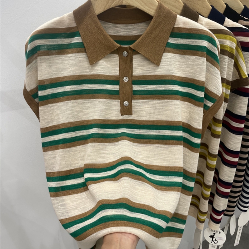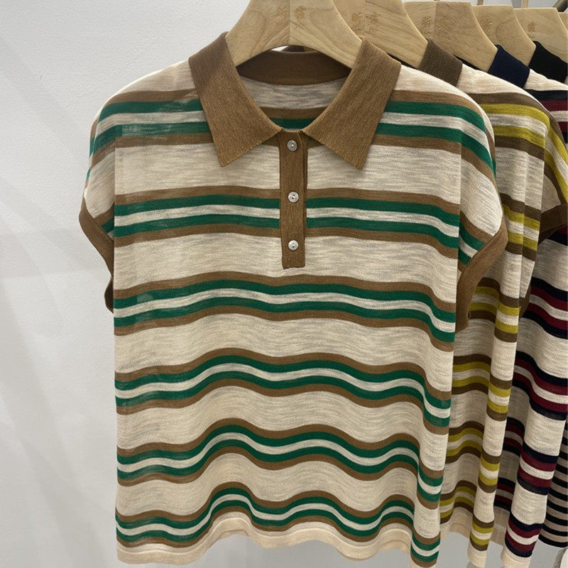 Polo领落肩袖冰丝针织短袖T恤女夏2025新款大码宽松条纹无袖上衣