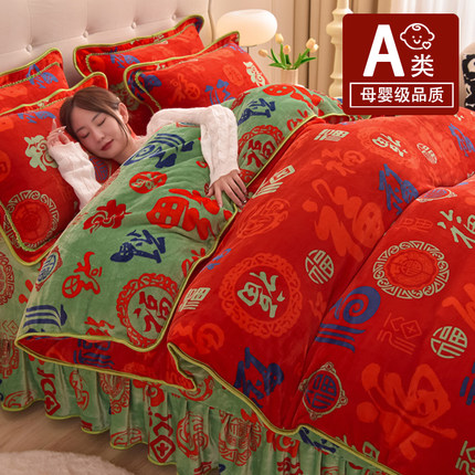 中式百福送礼牛奶绒床上四件套加厚珊瑚绒床单床裙法兰绒双面被套