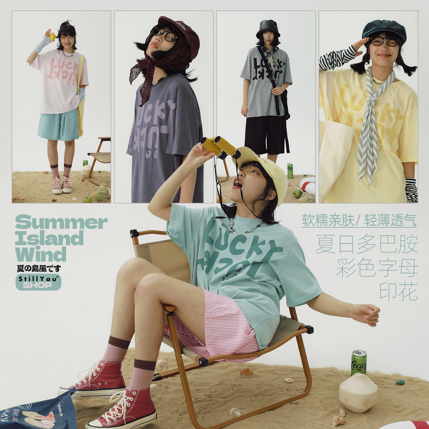 STILLYOU夏日轻薄多巴胺彩色字母印花圆领短袖T恤男女宽松半袖新