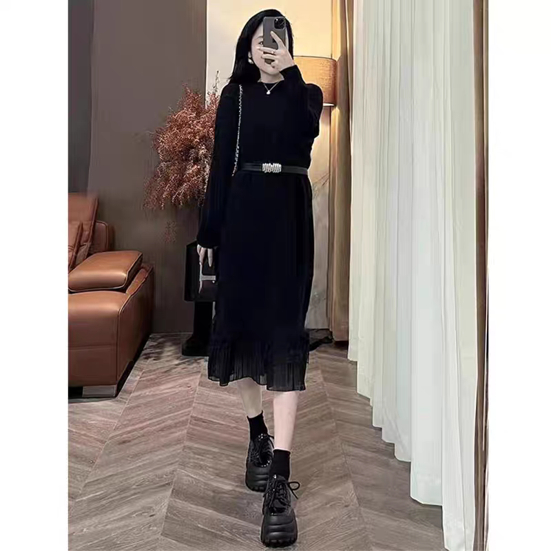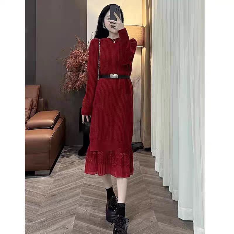 蕾丝拼接针织连衣裙女2024秋冬新款洋气显瘦中长款时尚打底毛衣裙