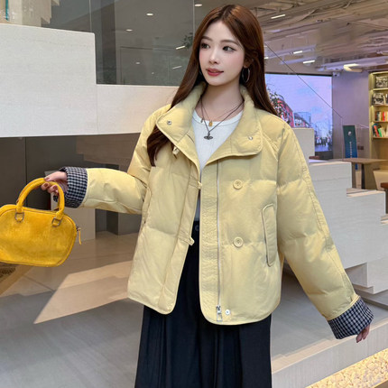 文艺范羽绒棉短款保暖外套美少女冬季流行新款格子拼接立领丝棉服
