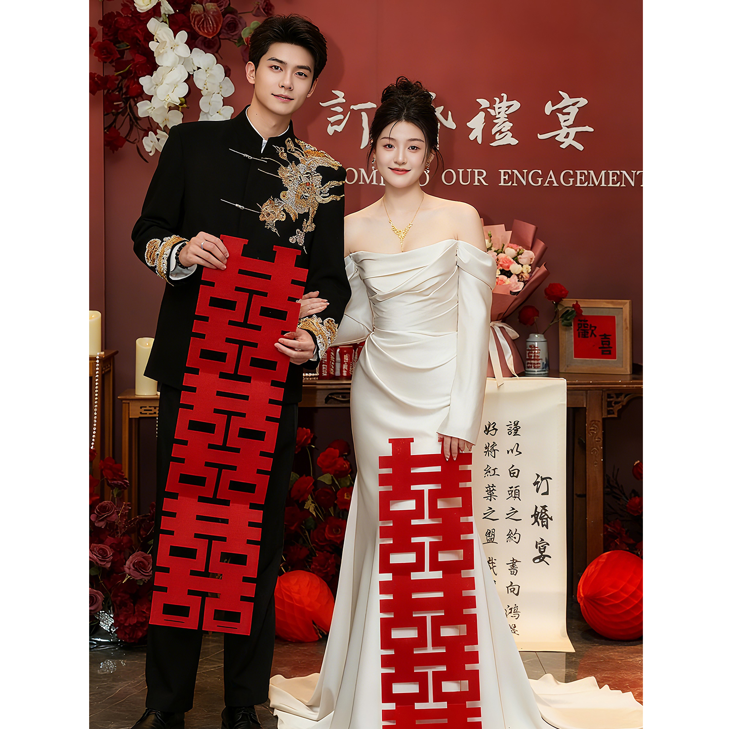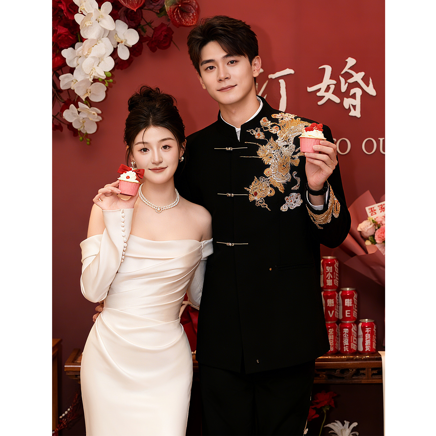 欢喜橙/新中式男士西装国风刺绣秀禾服订婚宴套装新郎高定婚服男