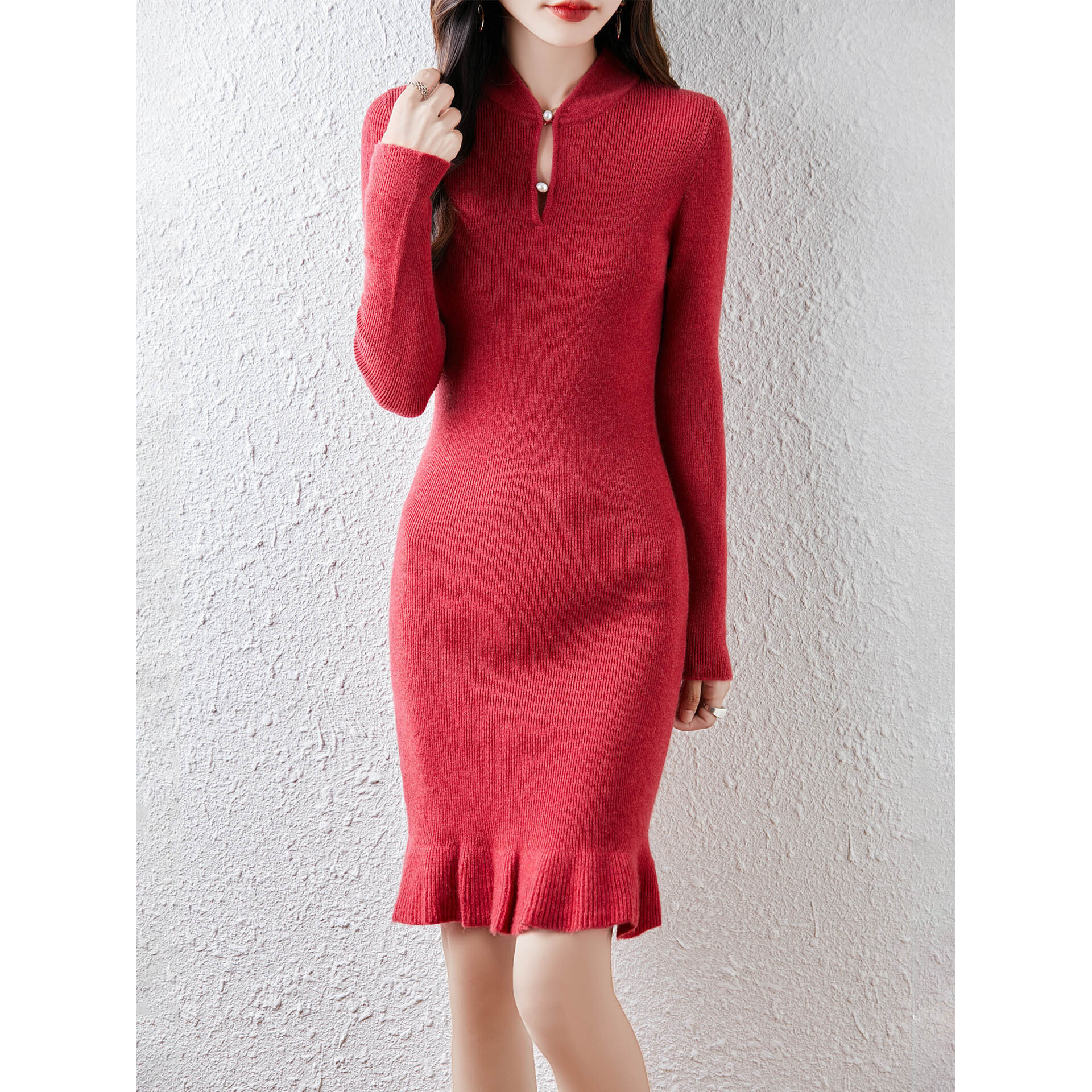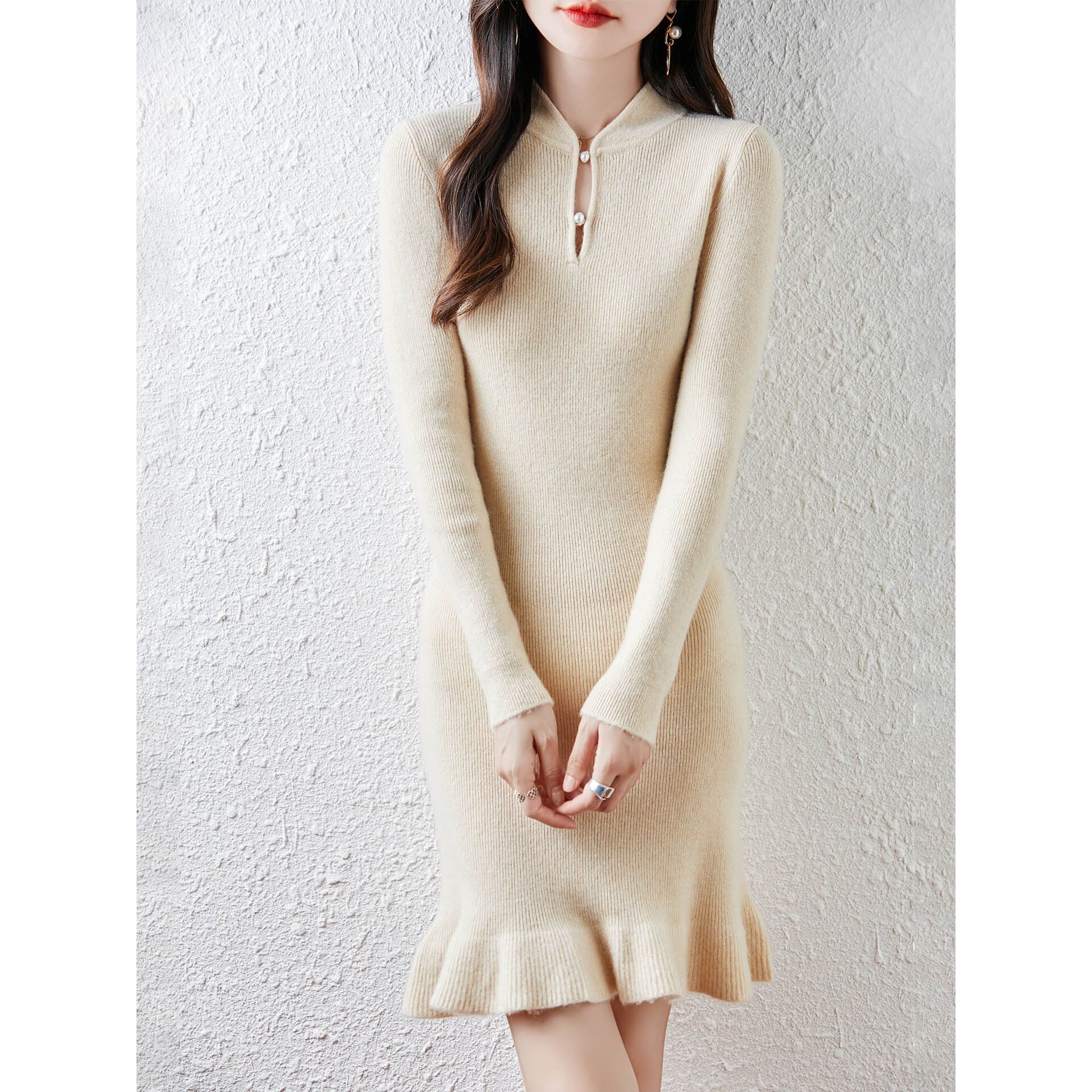25年秋冬新款新中式国风纯羊毛立领针织连衣裙长袖女修身显瘦短裙