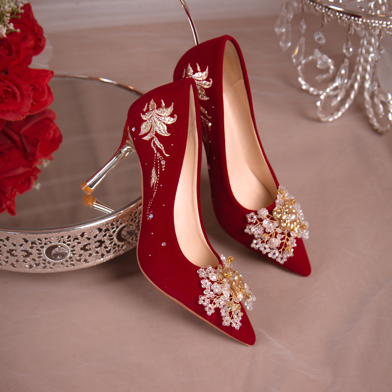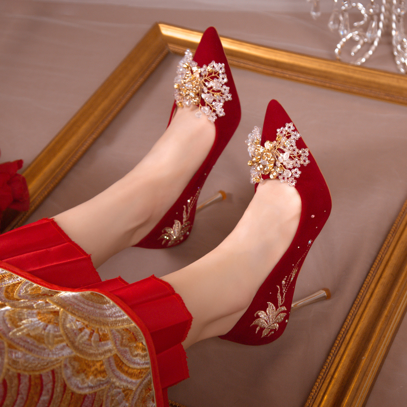 红色结婚鞋新娘鞋新款刺绣中式秀禾婚纱两穿孕妇订婚敬酒服高跟鞋