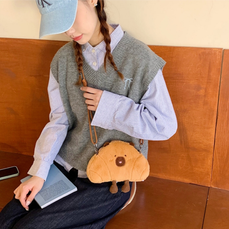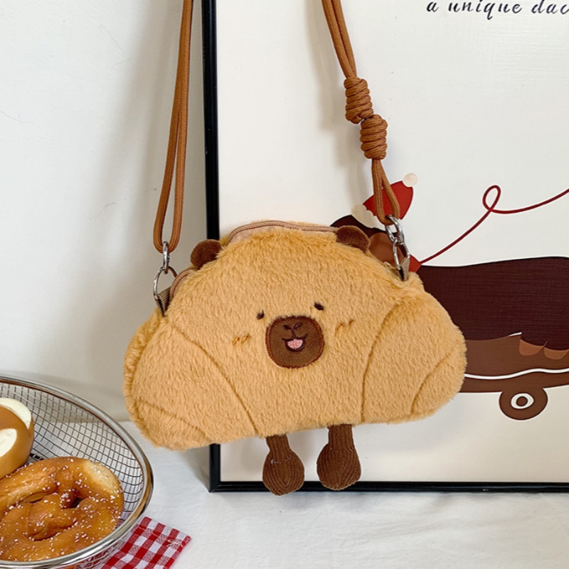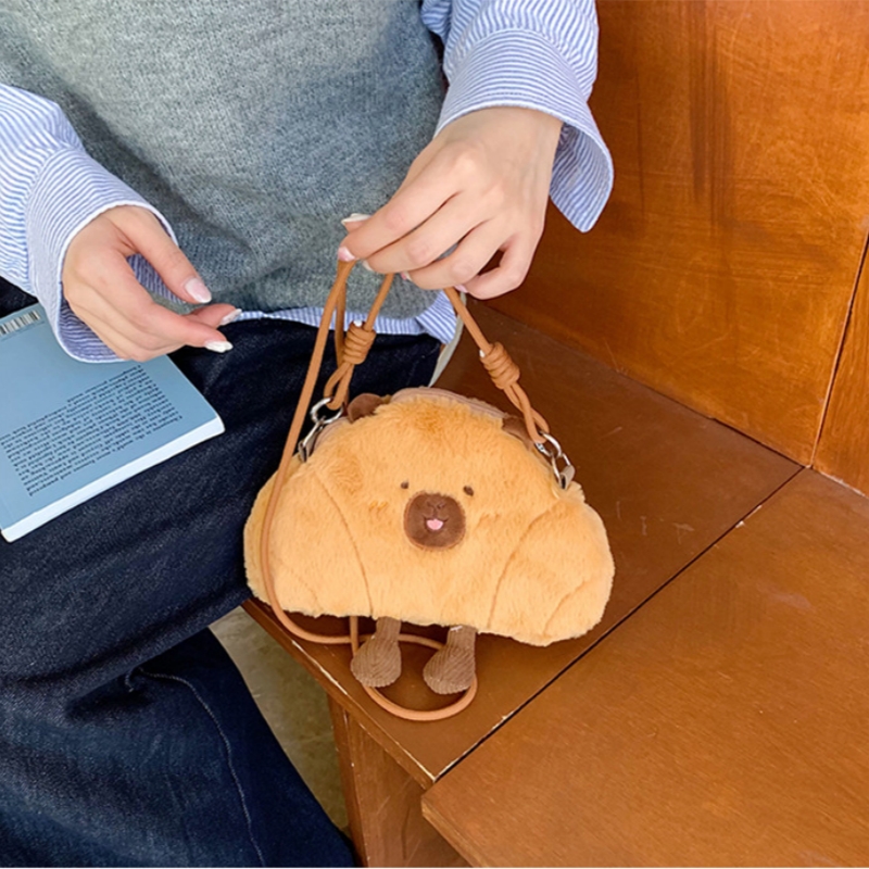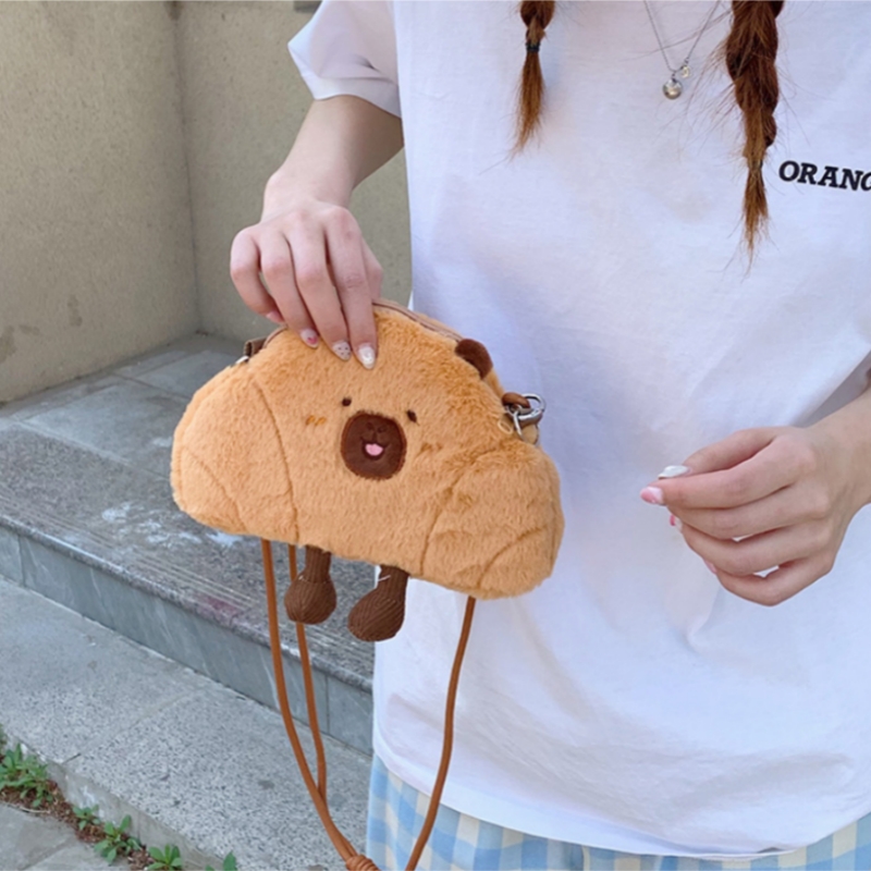 可爱牛角包水豚单肩包网红毛绒玩具卡皮巴拉玩偶斜挎手机包送礼物