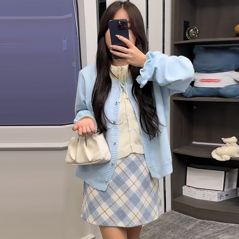 韩系假两件针织衫上衣格呢半身裙胖mm2025秋季款显瘦宽松大码女装