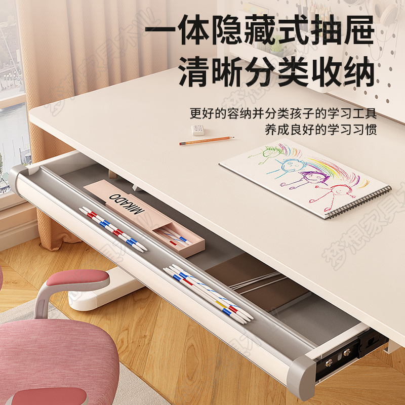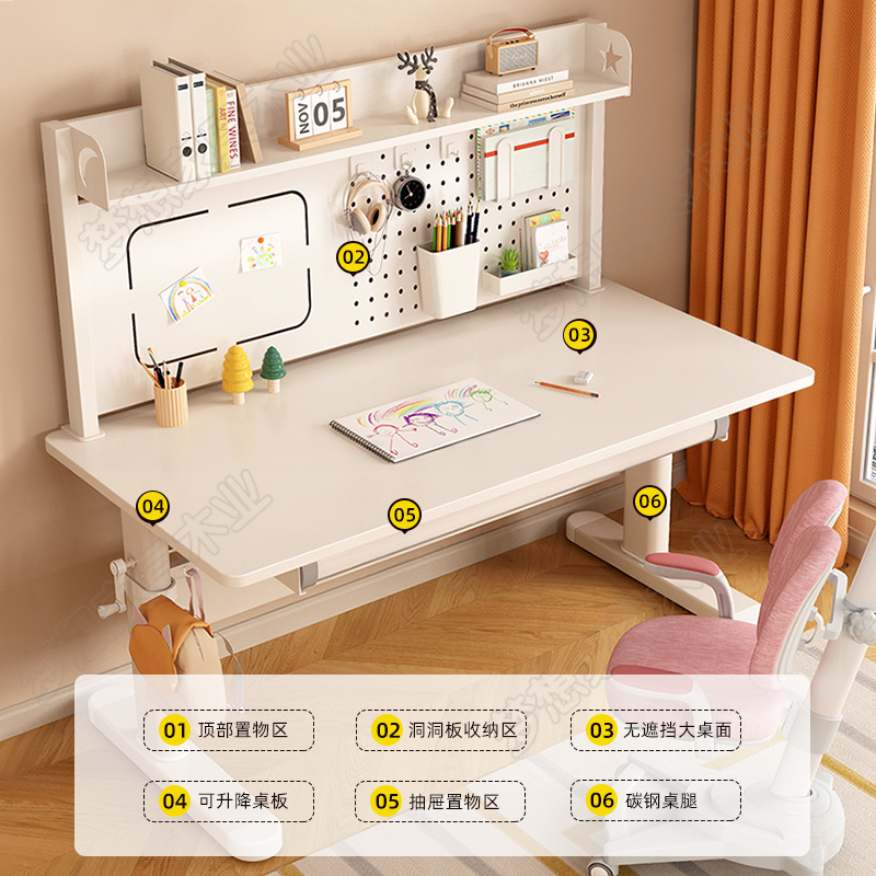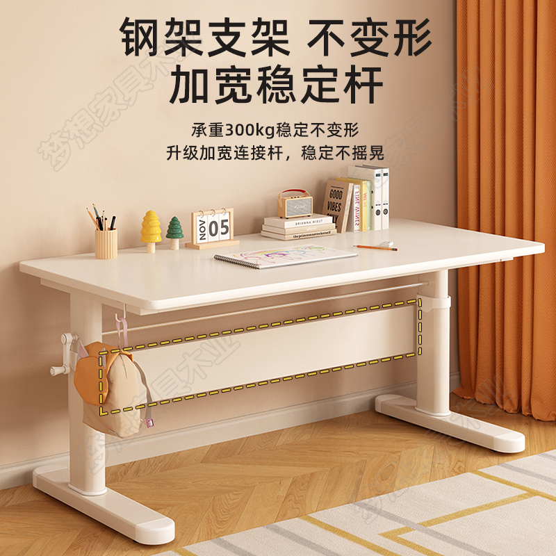 升降儿童学习桌椅家用学生书桌书架一体卧室电脑写字桌实木大白桌