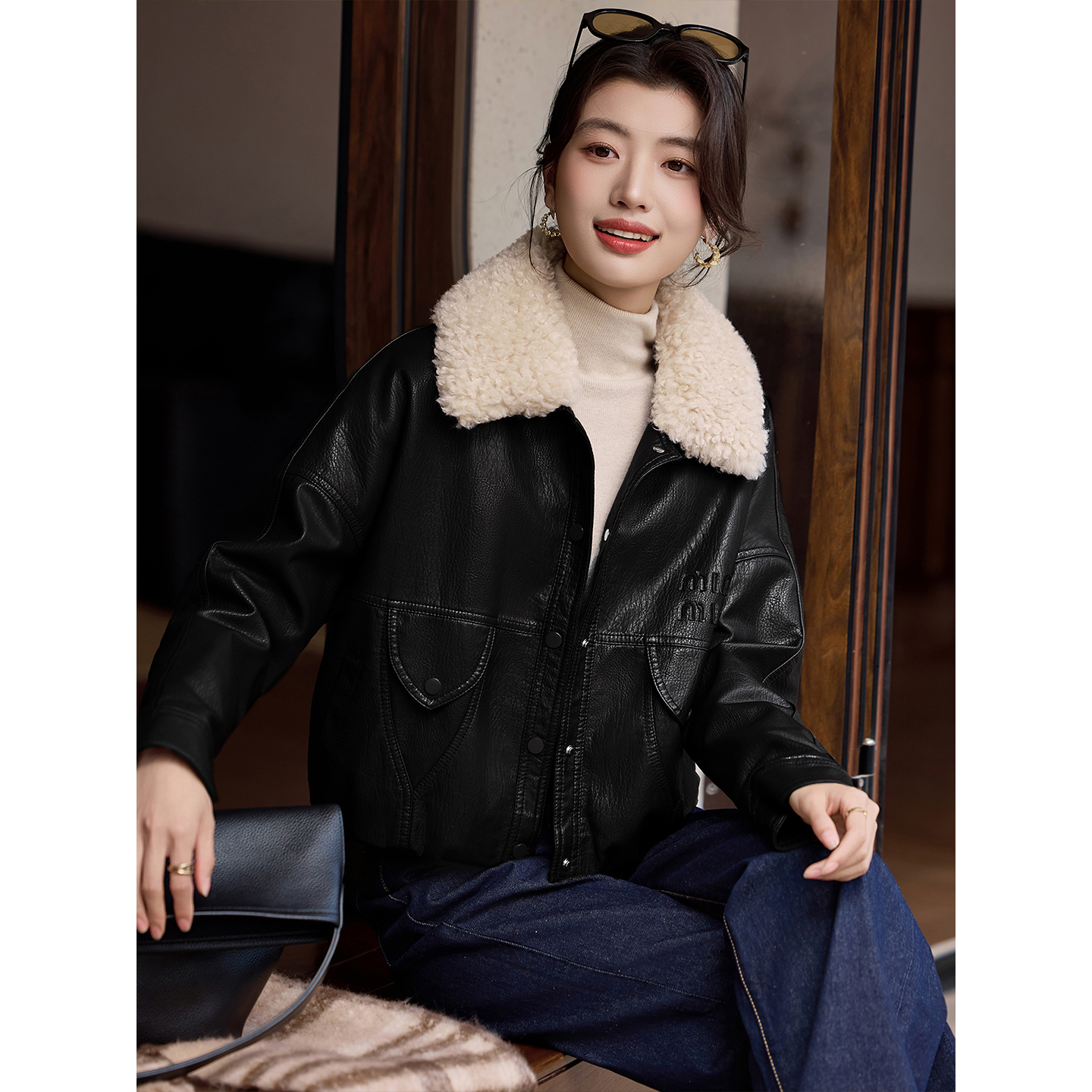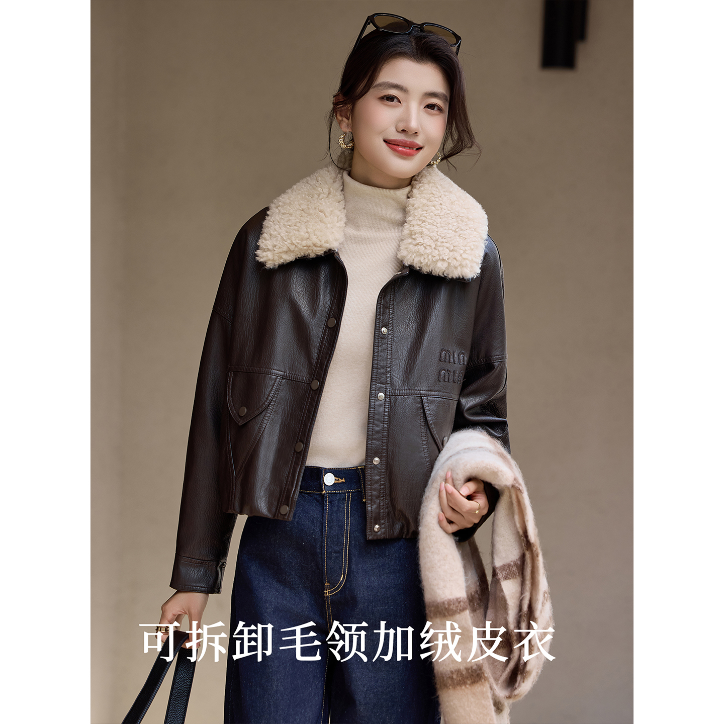 今年流行爆款咖色翻领皮衣女款2025年新款酷飒风加绒大毛领短外套