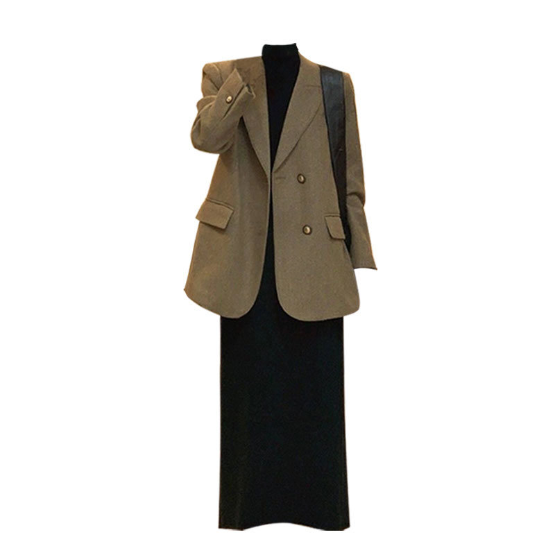 大码胖mm春秋穿搭一整套高级感毛呢西装外套上衣+内搭连衣裙套装