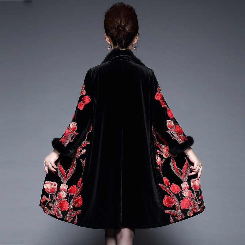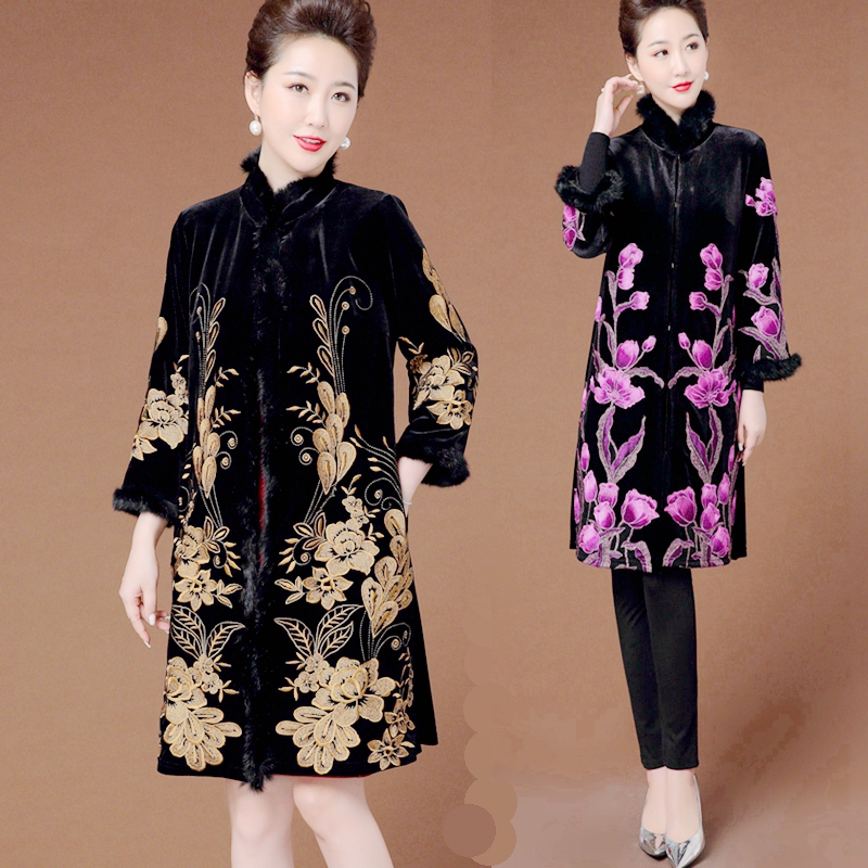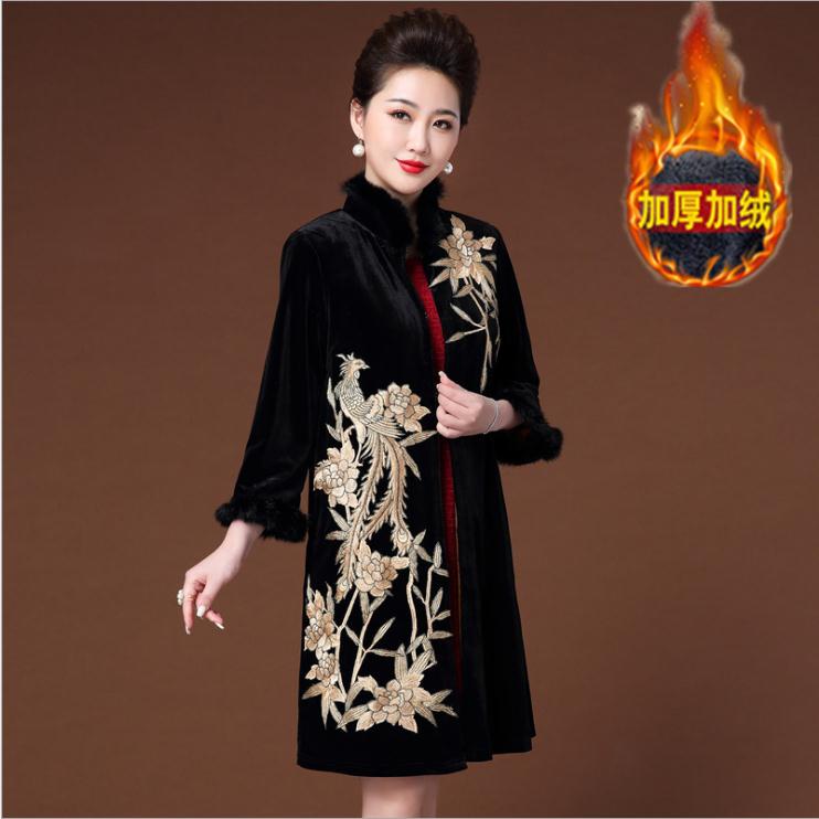 高贵大码婚礼妈妈秋冬加绒外套中长款宽松中老年人女装金丝绒风衣