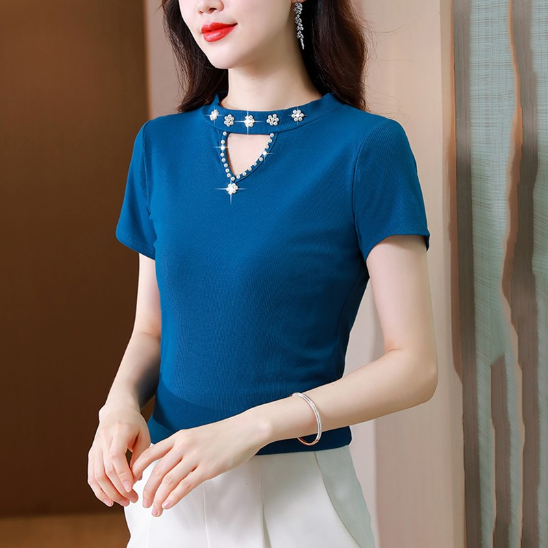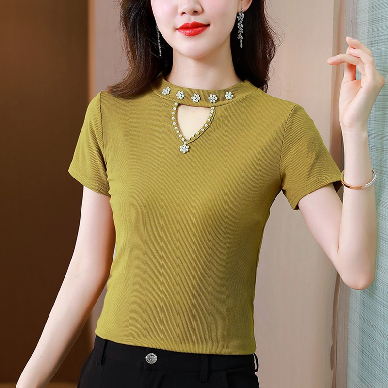 设计感短袖针织t恤女装新款短袖钉珠上衣2023年别致百搭打底小衫