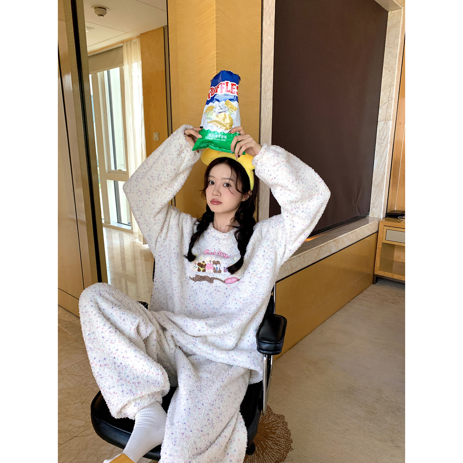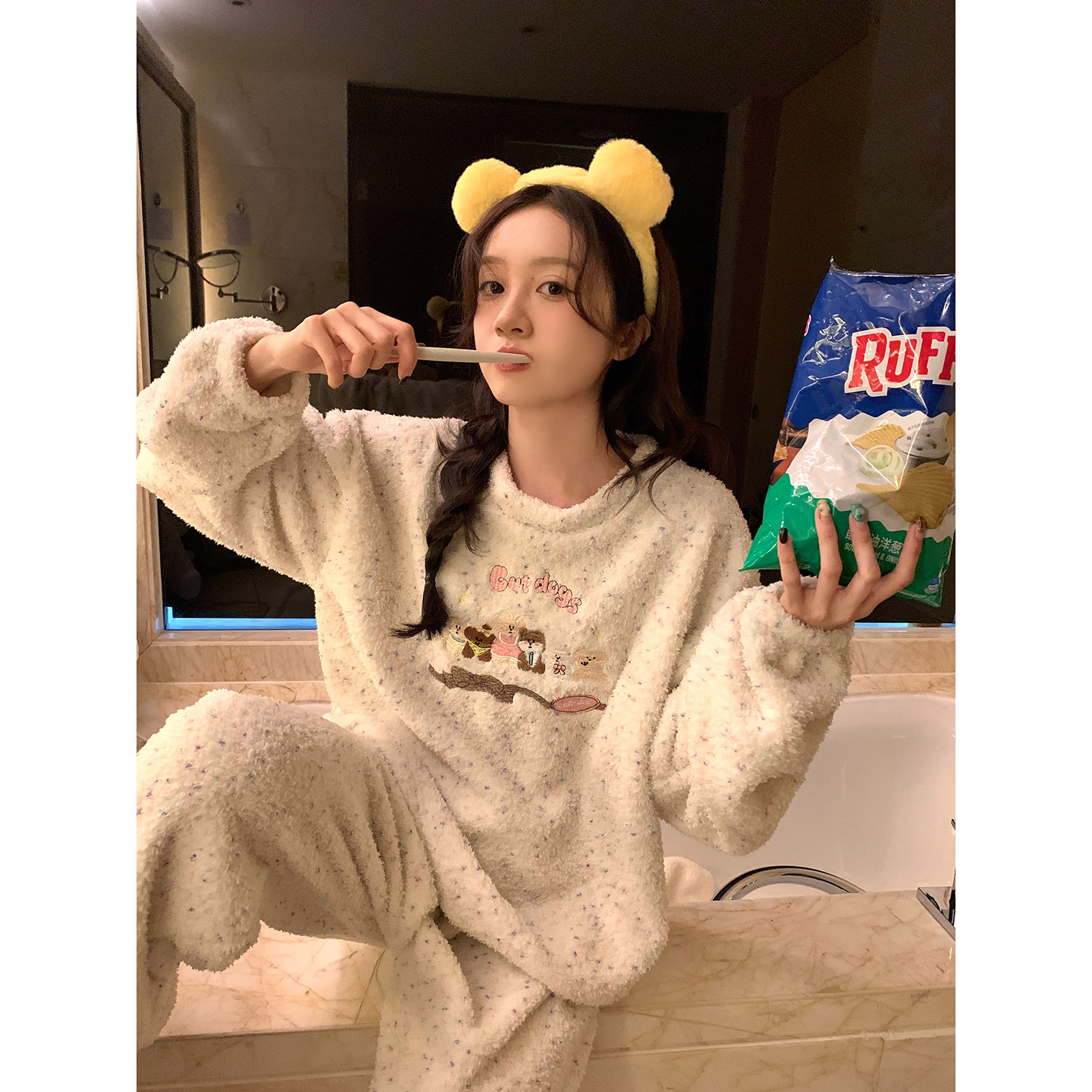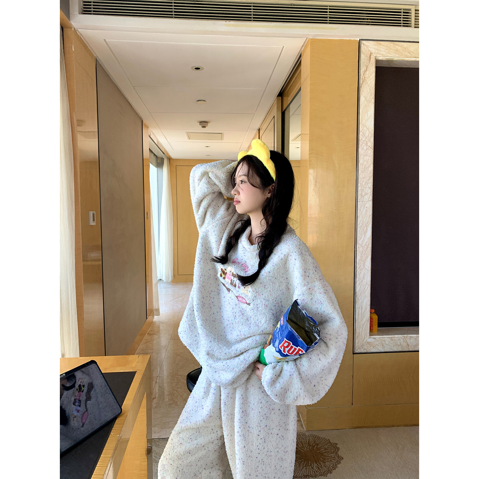 馨帮帮Homedress 秋冬季卡通珊瑚绒睡衣女宽松圆领加厚家居服套装