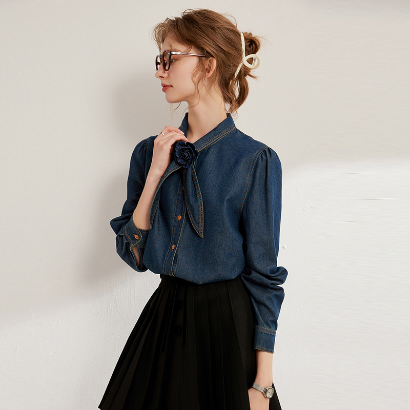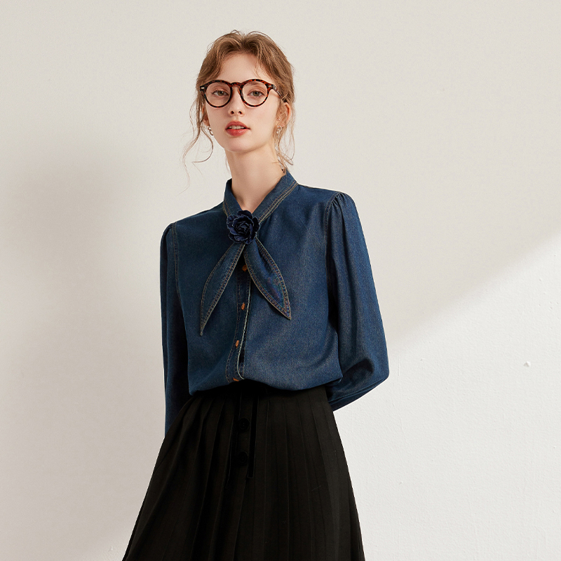 白鹿语系带兔耳领牛仔衬衣2025春季新款时髦花朵长袖休闲女式衬衫